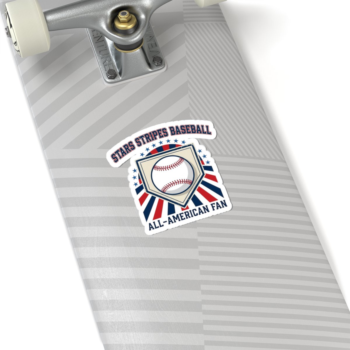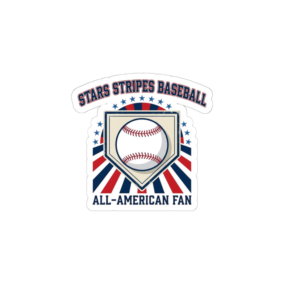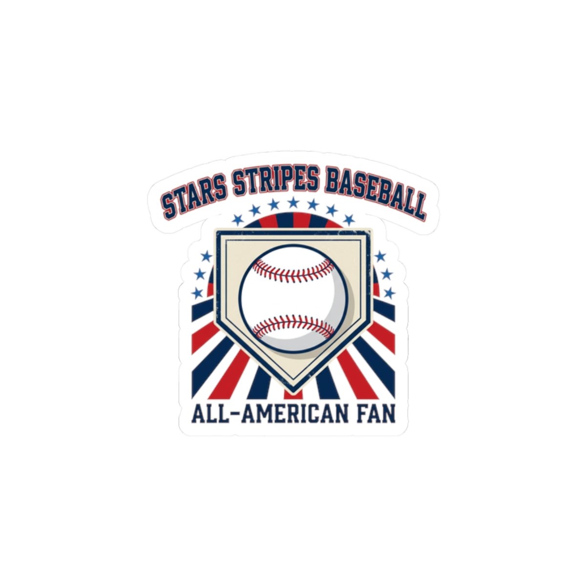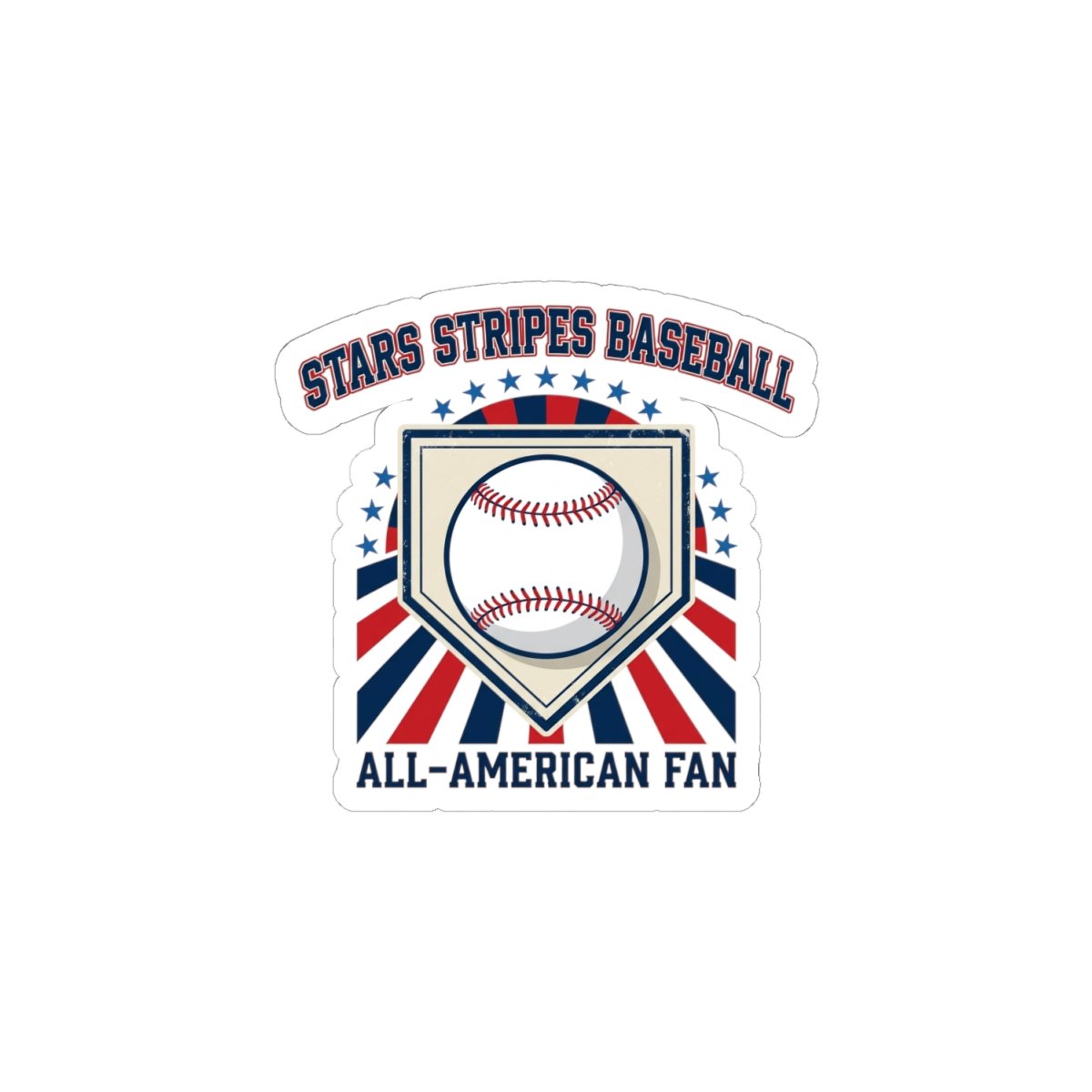 Retro patriotic baseball sticker featuring a classic baseball centered in a home-plate shield with radiating red, white, and blue rays and vintage athletic lettering. The design channels a ballpark aesthetic and nostalgic sports typography, pairing national pride with old-school baseball vibes that suit season-long fandom, tailgates, and game-day setups. Use it to badge up laptops, water bottles, journals, or gear while keeping a spirited, competitive look tied to the patriotic baseball trend.