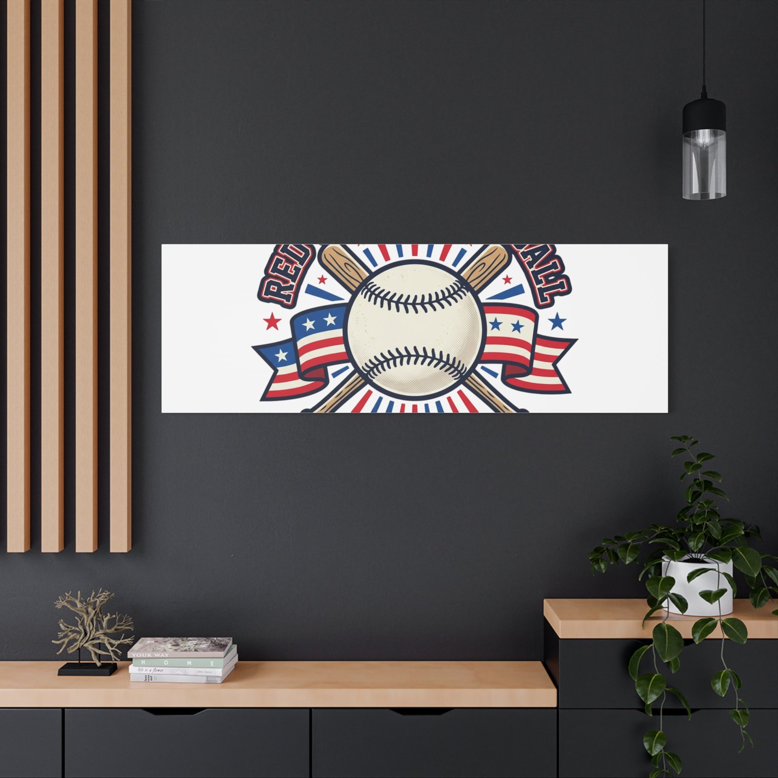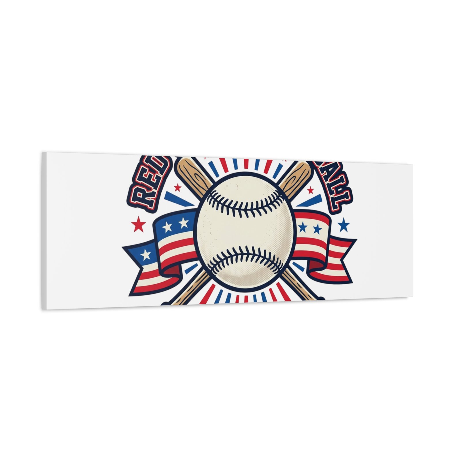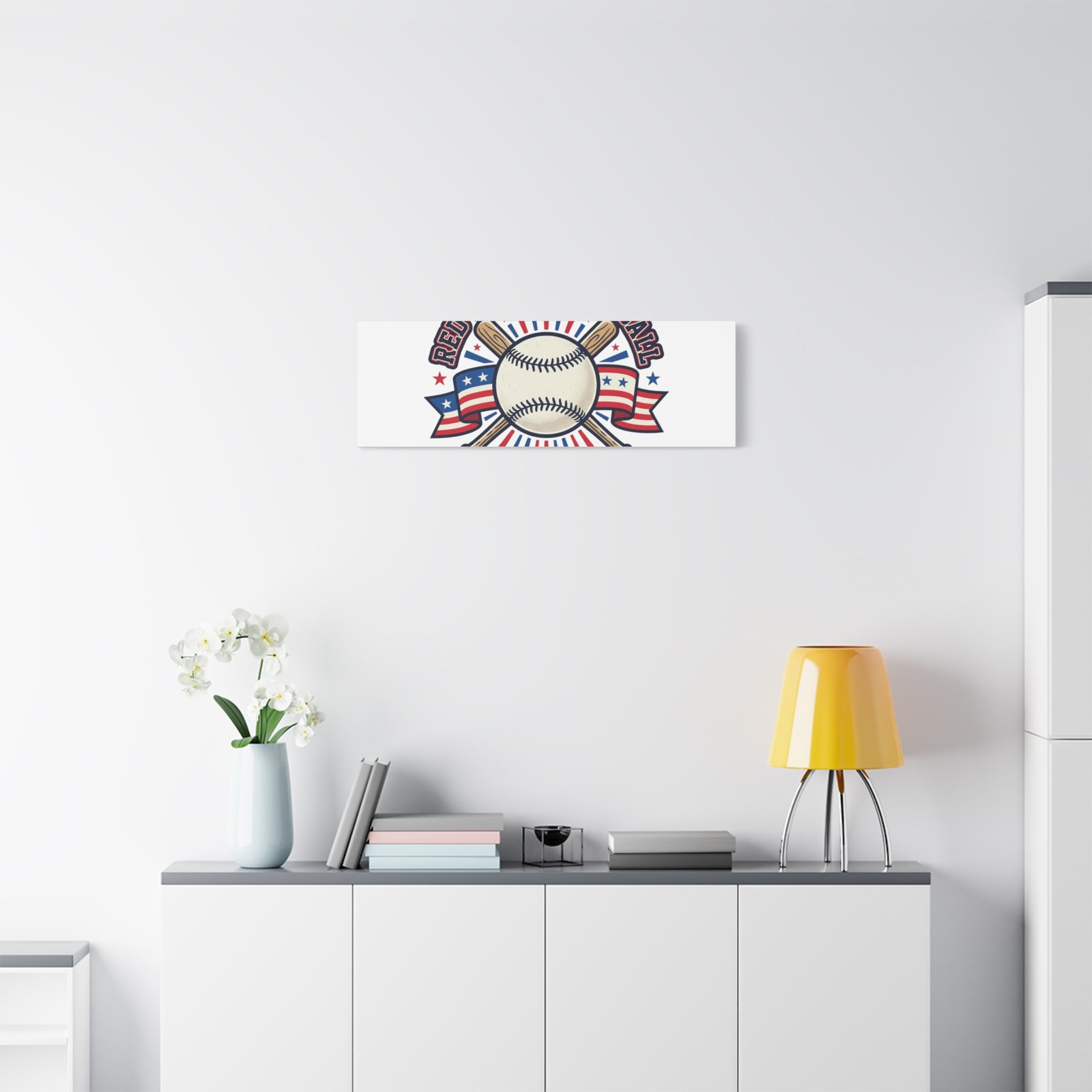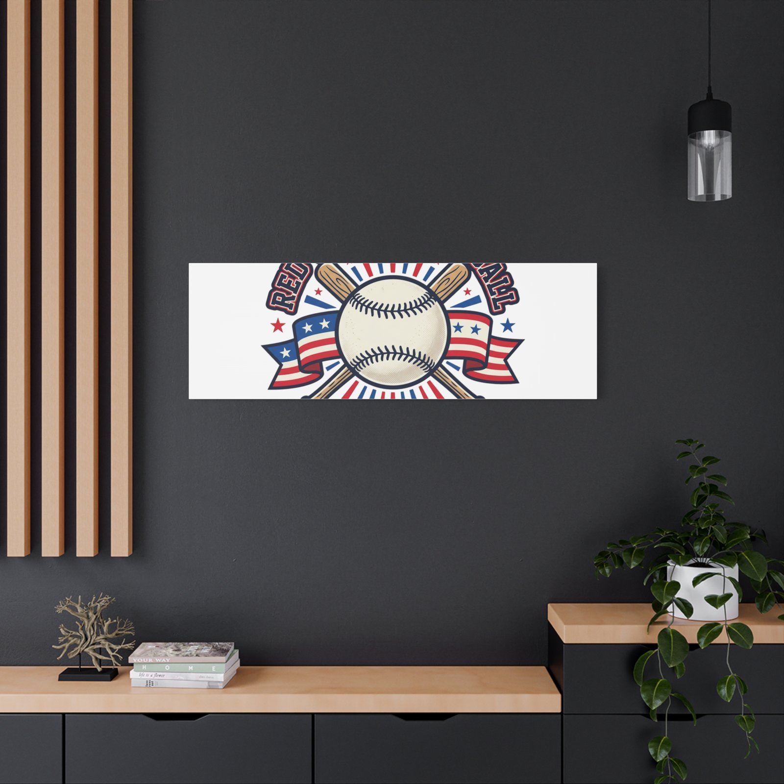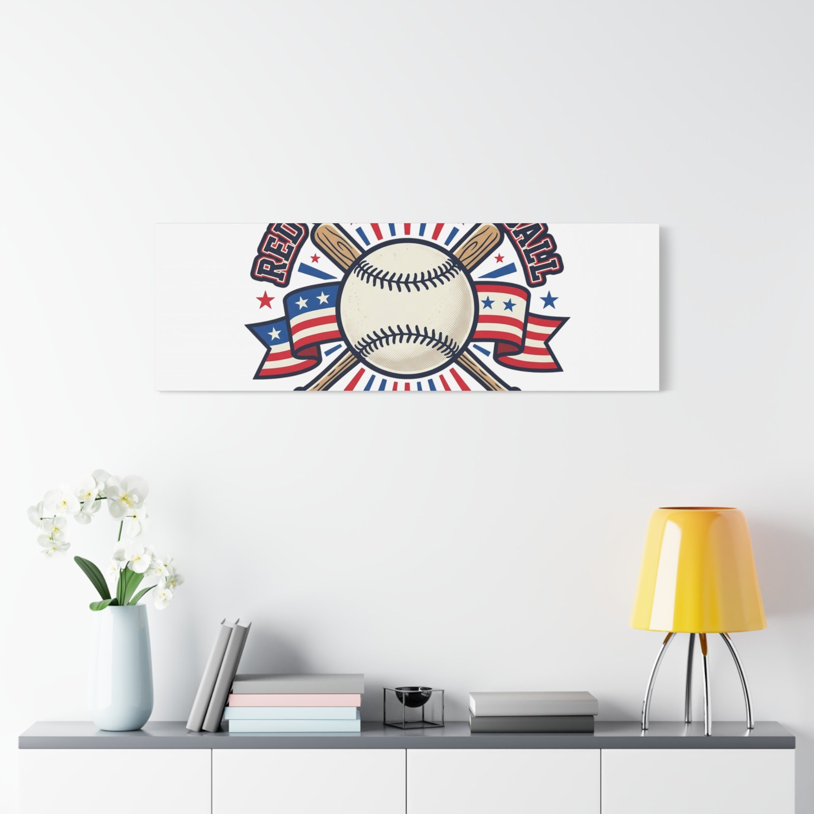 Retro baseball crest printed on matte stretched canvas in a red-white-and-blue palette. The artwork centers on a vintage-style baseball with crossed bats, patriotic ribbon accents and starburst details, channeling a ballpark aesthetic and nostalgic athletic typography. Suited for fans who want a spirited, hometown-game vibe on their wall during baseball season or watch parties.
