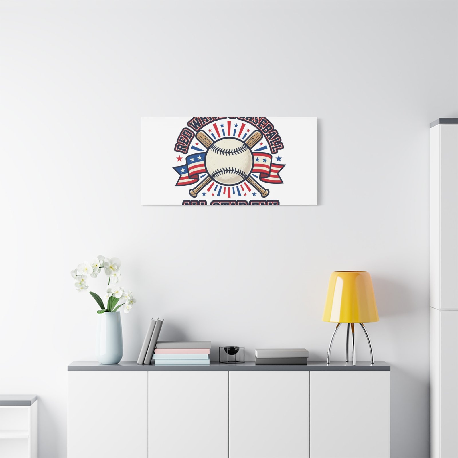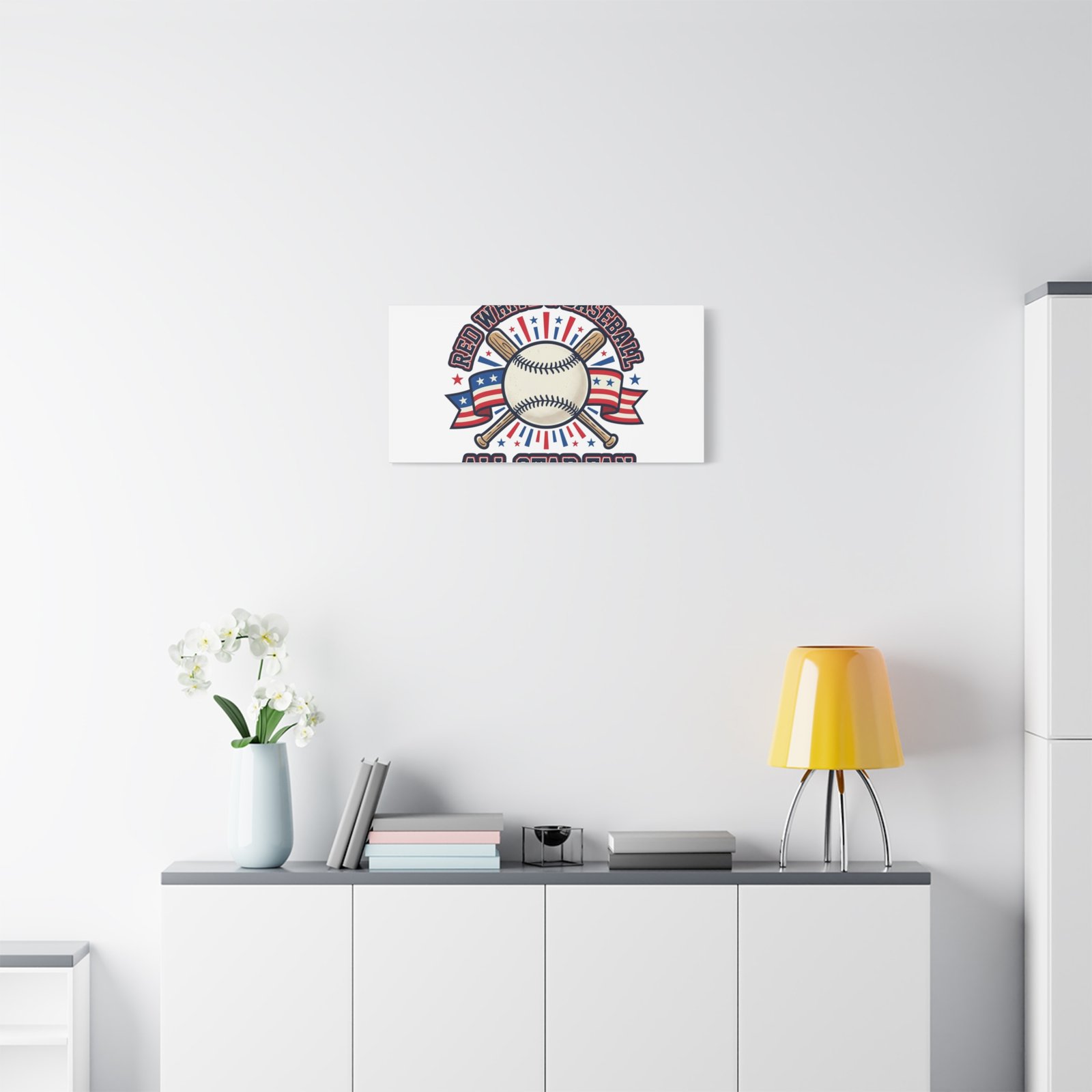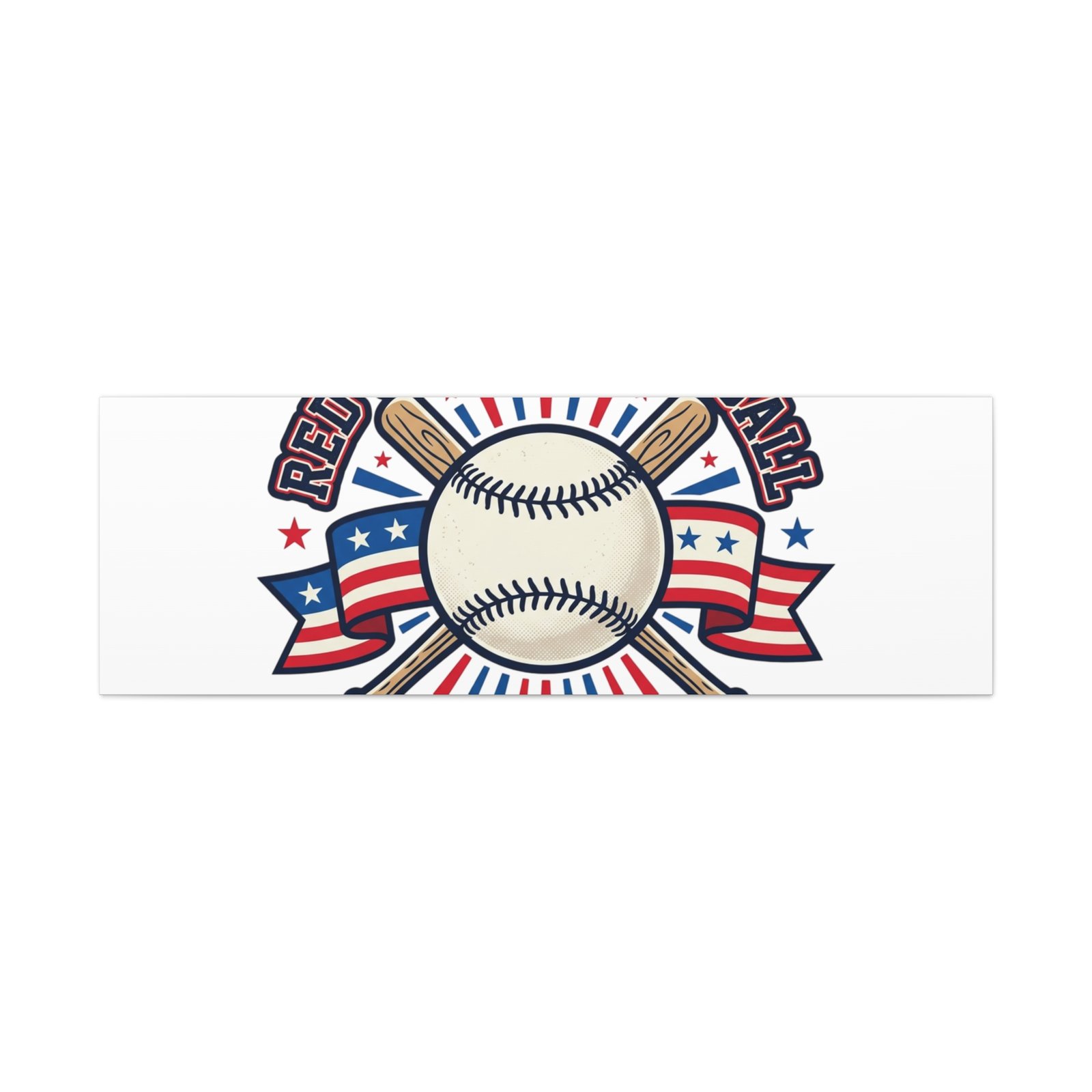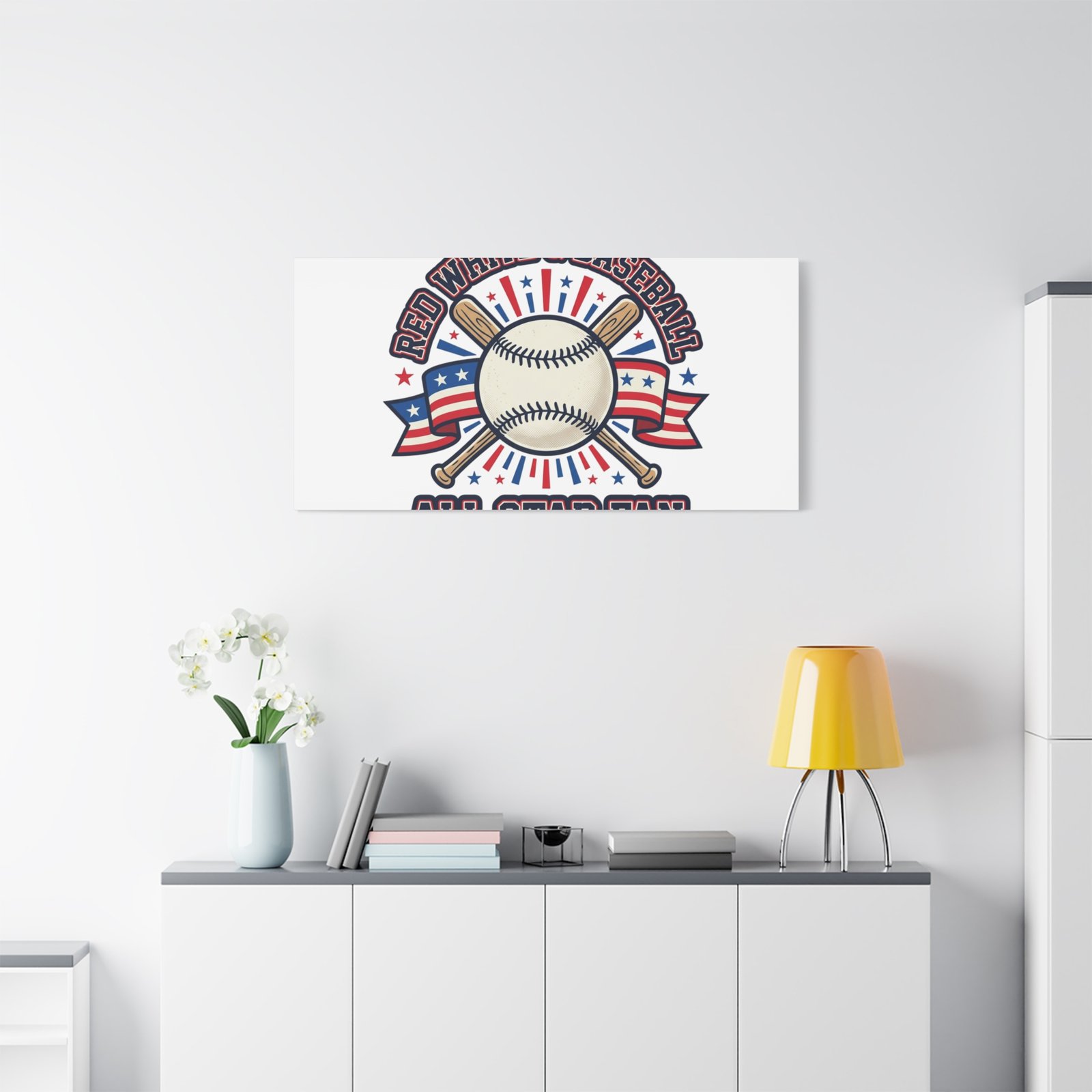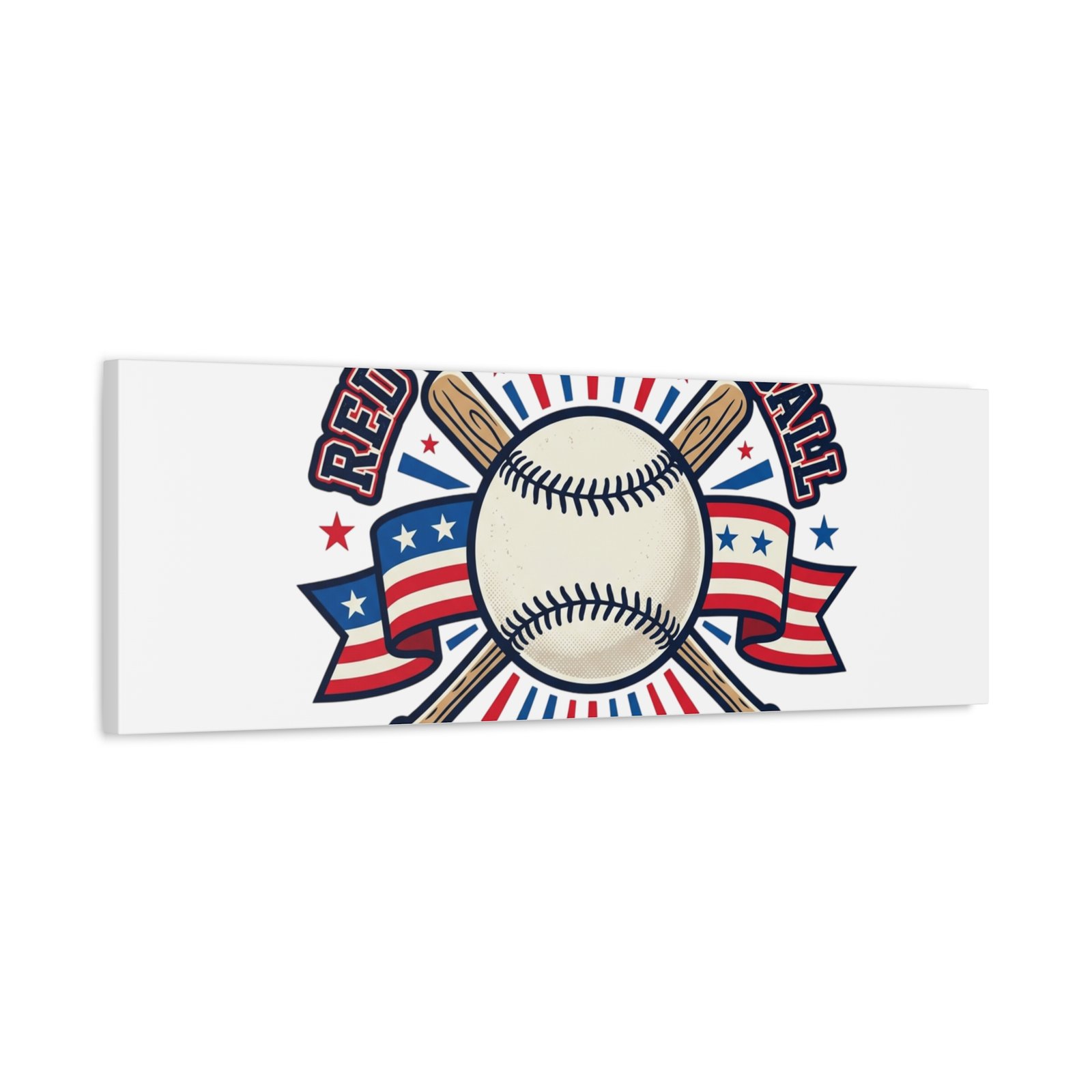 Retro baseball crest printed on matte stretched canvas in a red-white-and-blue palette. The artwork centers on a vintage-style baseball with crossed bats, patriotic ribbon accents and starburst details, channeling a ballpark aesthetic and nostalgic athletic typography. Suited for fans who want a spirited, hometown-game vibe on their wall during baseball season or watch parties.
