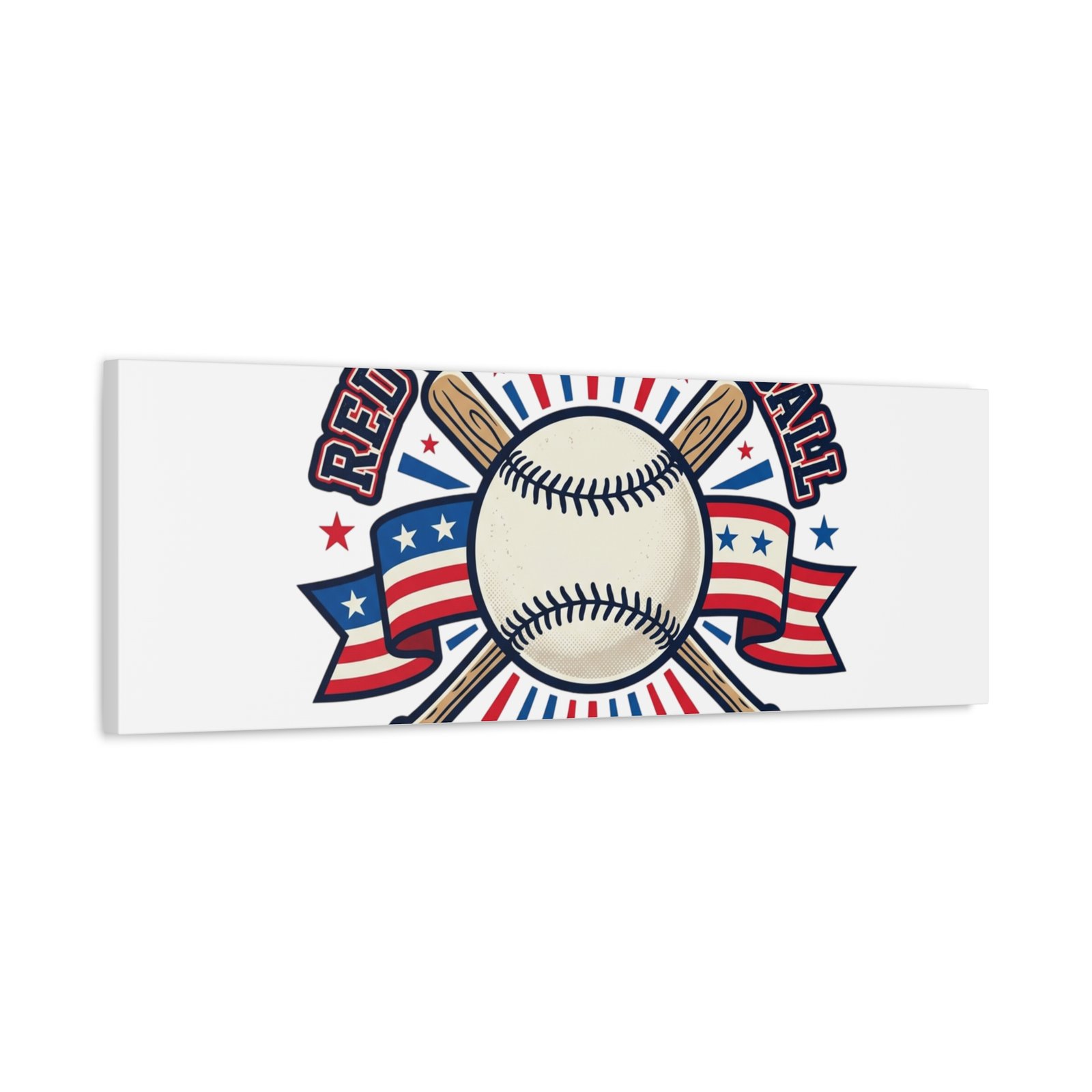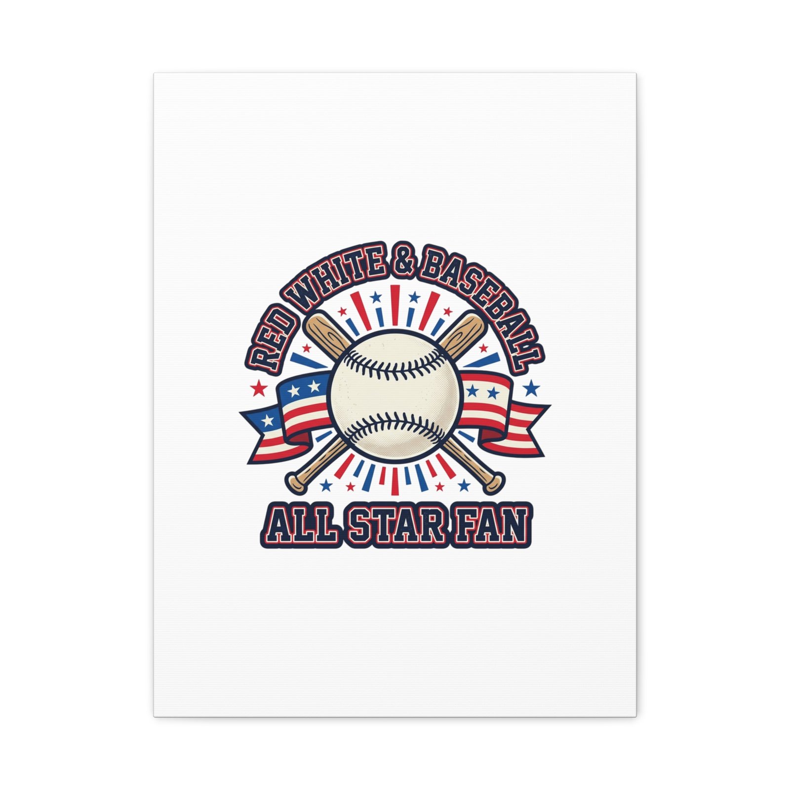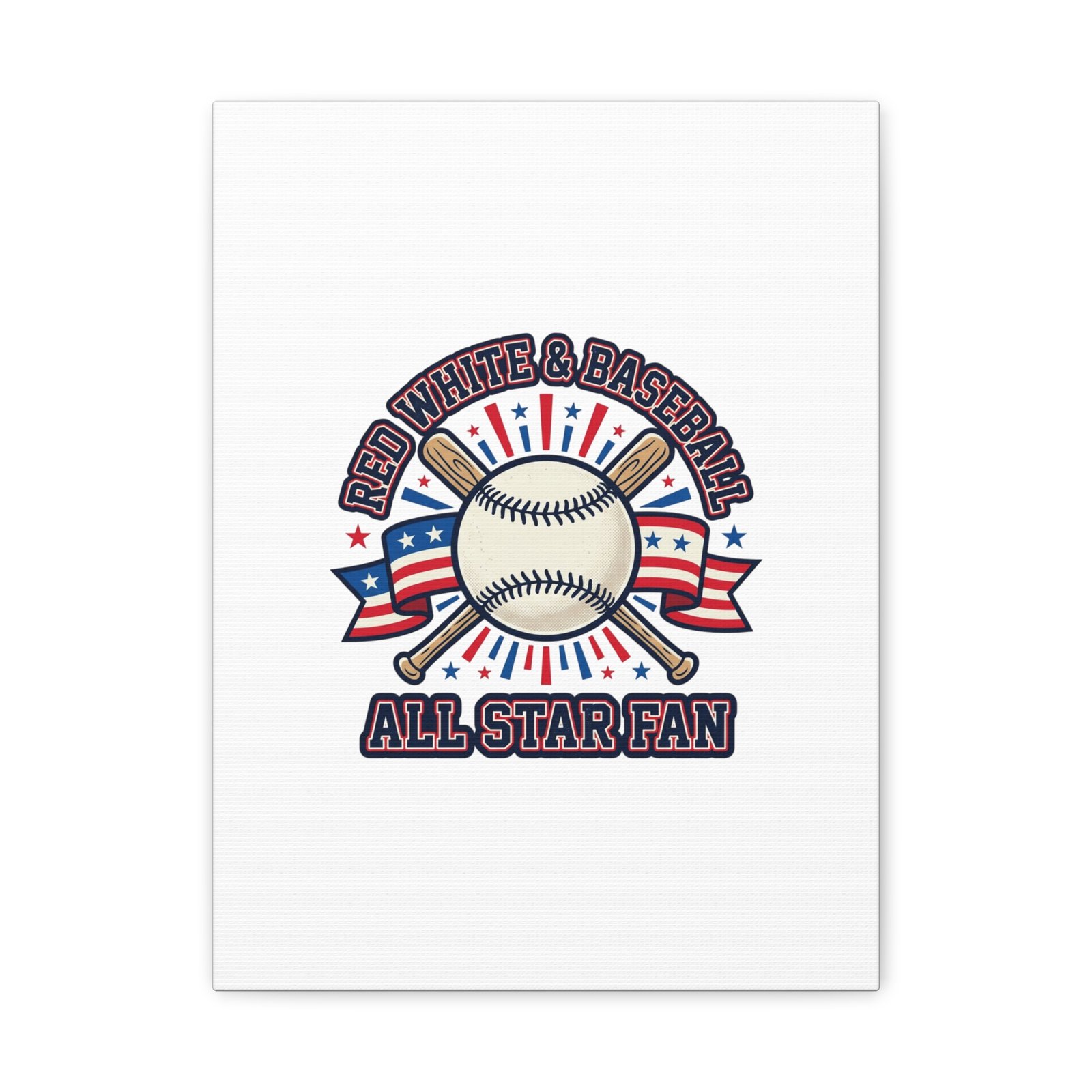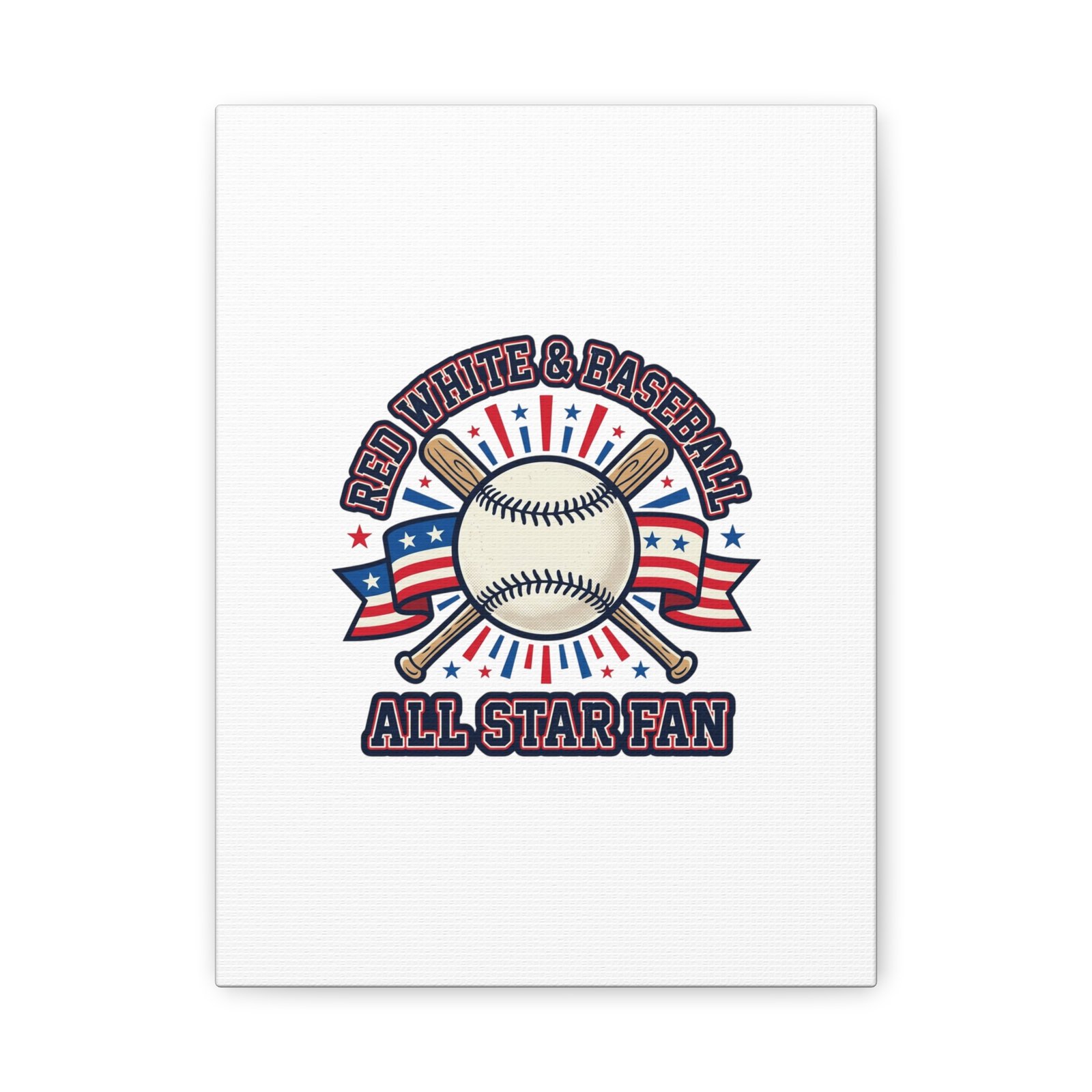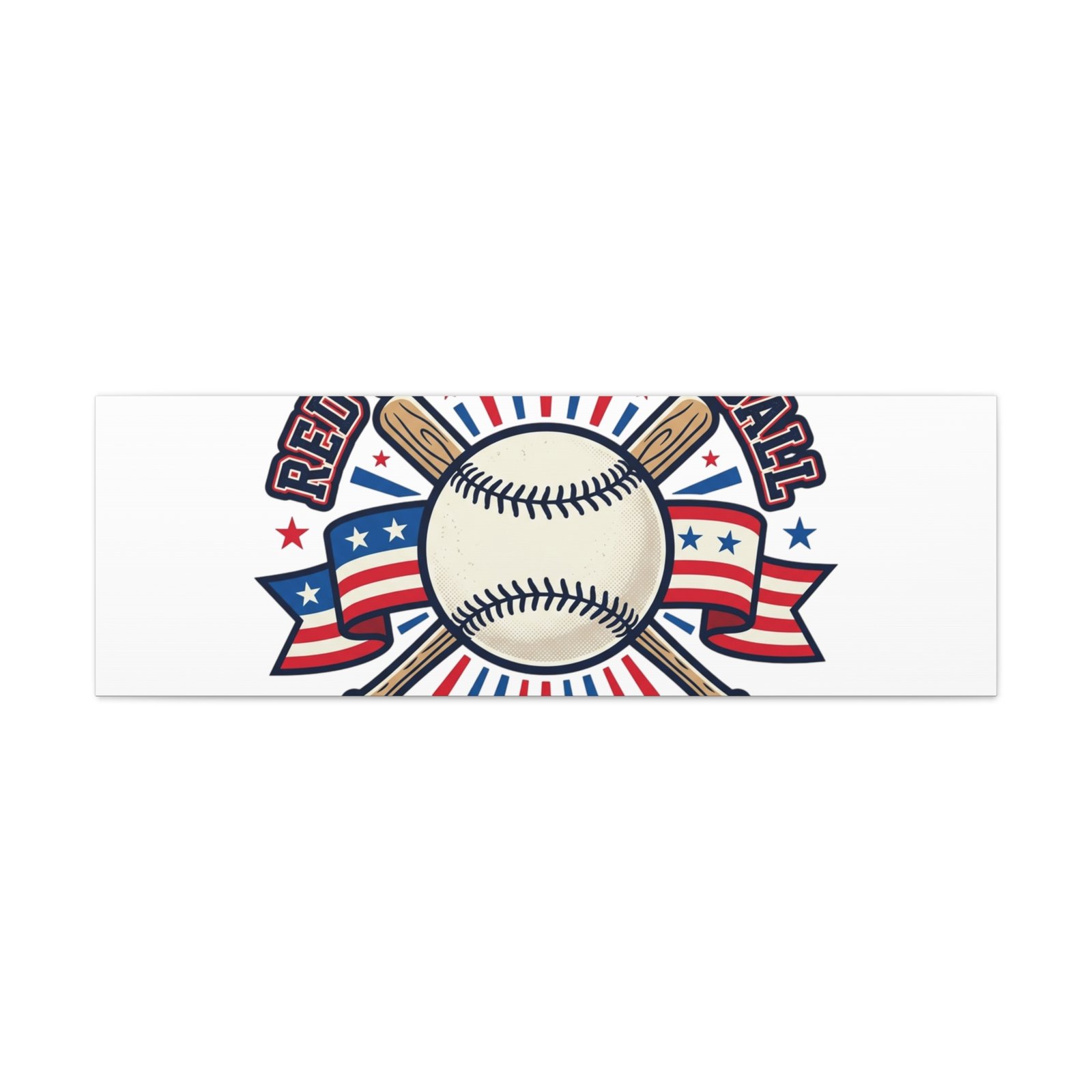 Retro baseball crest printed on matte stretched canvas in a red-white-and-blue palette. The artwork centers on a vintage-style baseball with crossed bats, patriotic ribbon accents and starburst details, channeling a ballpark aesthetic and nostalgic athletic typography. Suited for fans who want a spirited, hometown-game vibe on their wall during baseball season or watch parties. Product features – Unique coating with UL-certified Greenguard Gold inks – Cotton and polyester composite canvas; pine wood frame – Printed with non-hazardous latex inks – Soft rubber dots on bottom back corners for support – Back hanging included; available in multiple orientations and sizes Care instructions – If the canvas does gather any dust, you may wipe it off gently with a clean, damp cloth.
