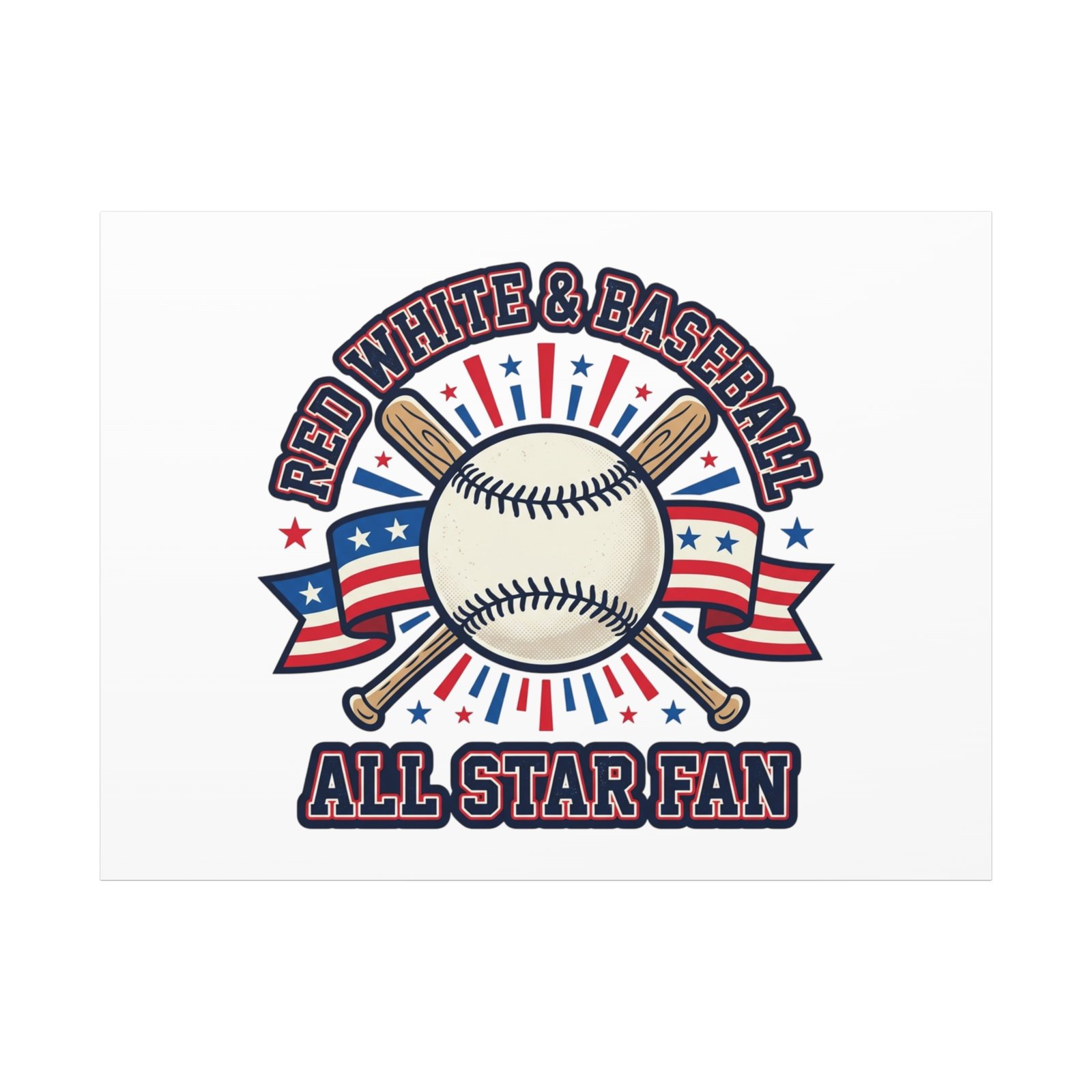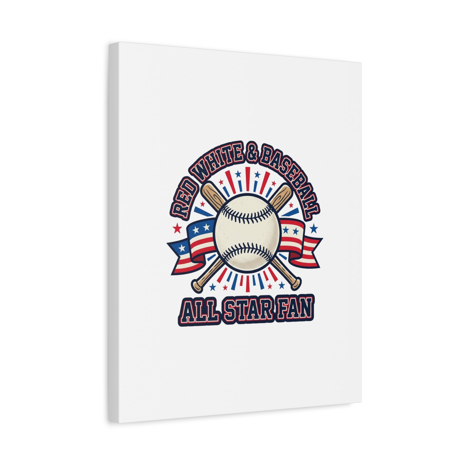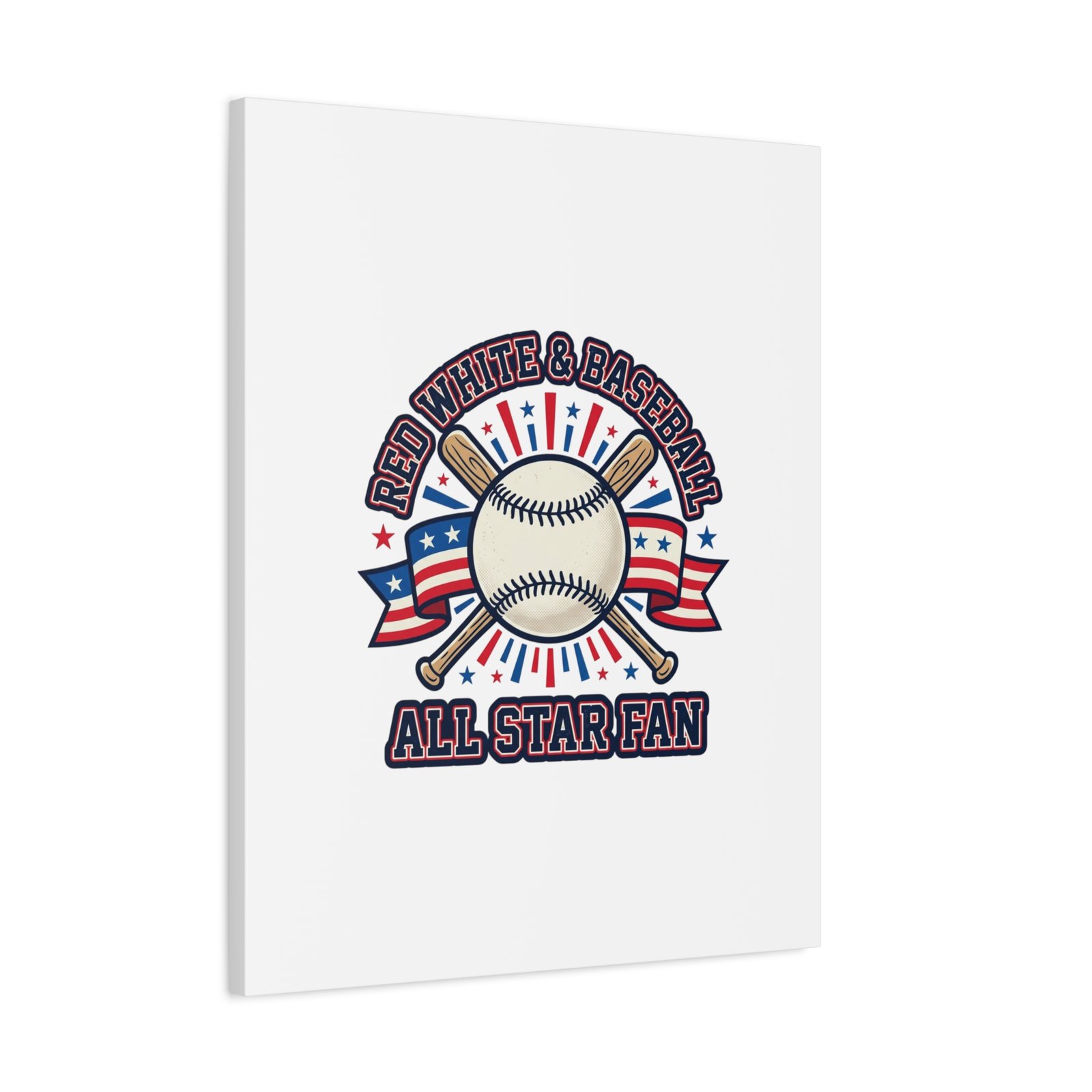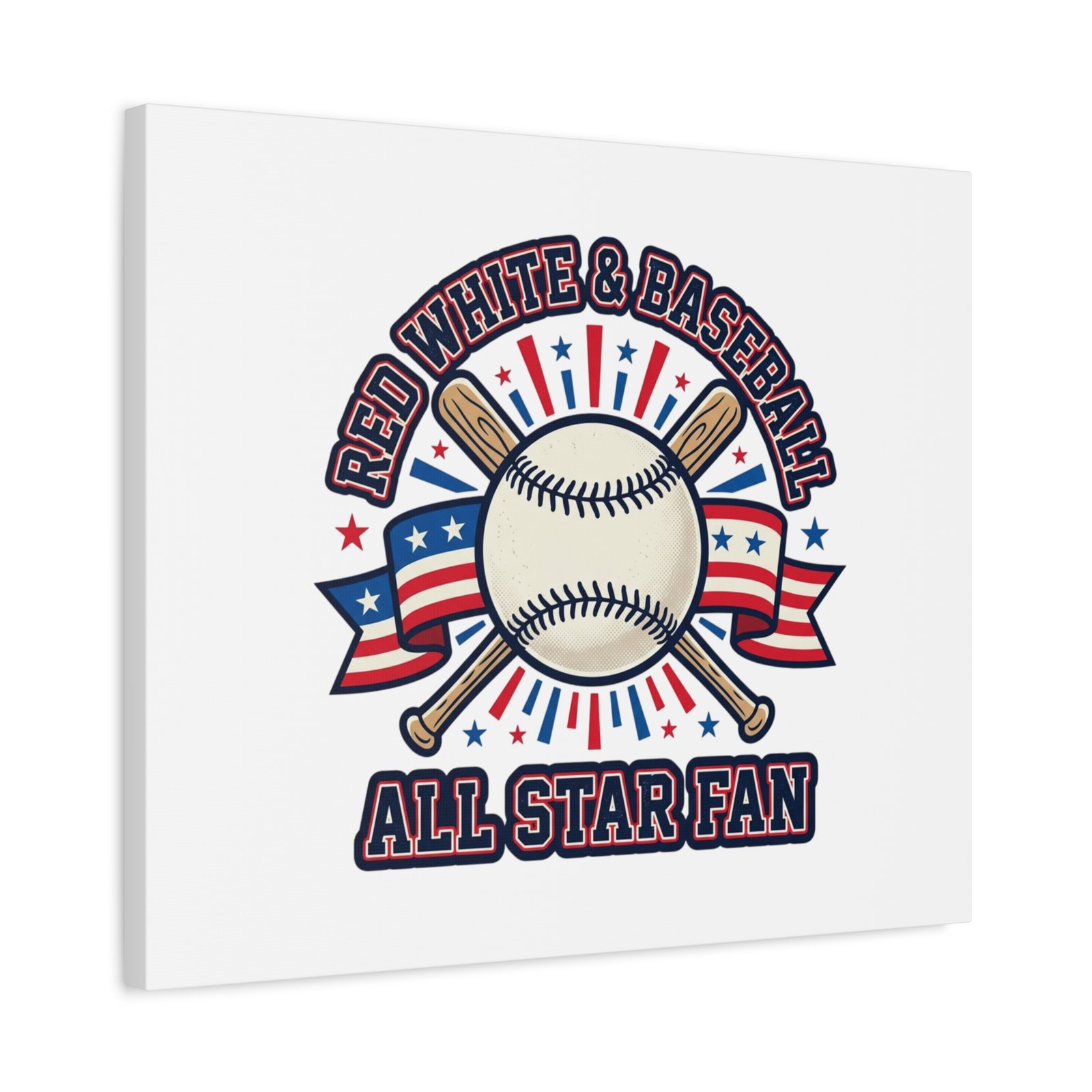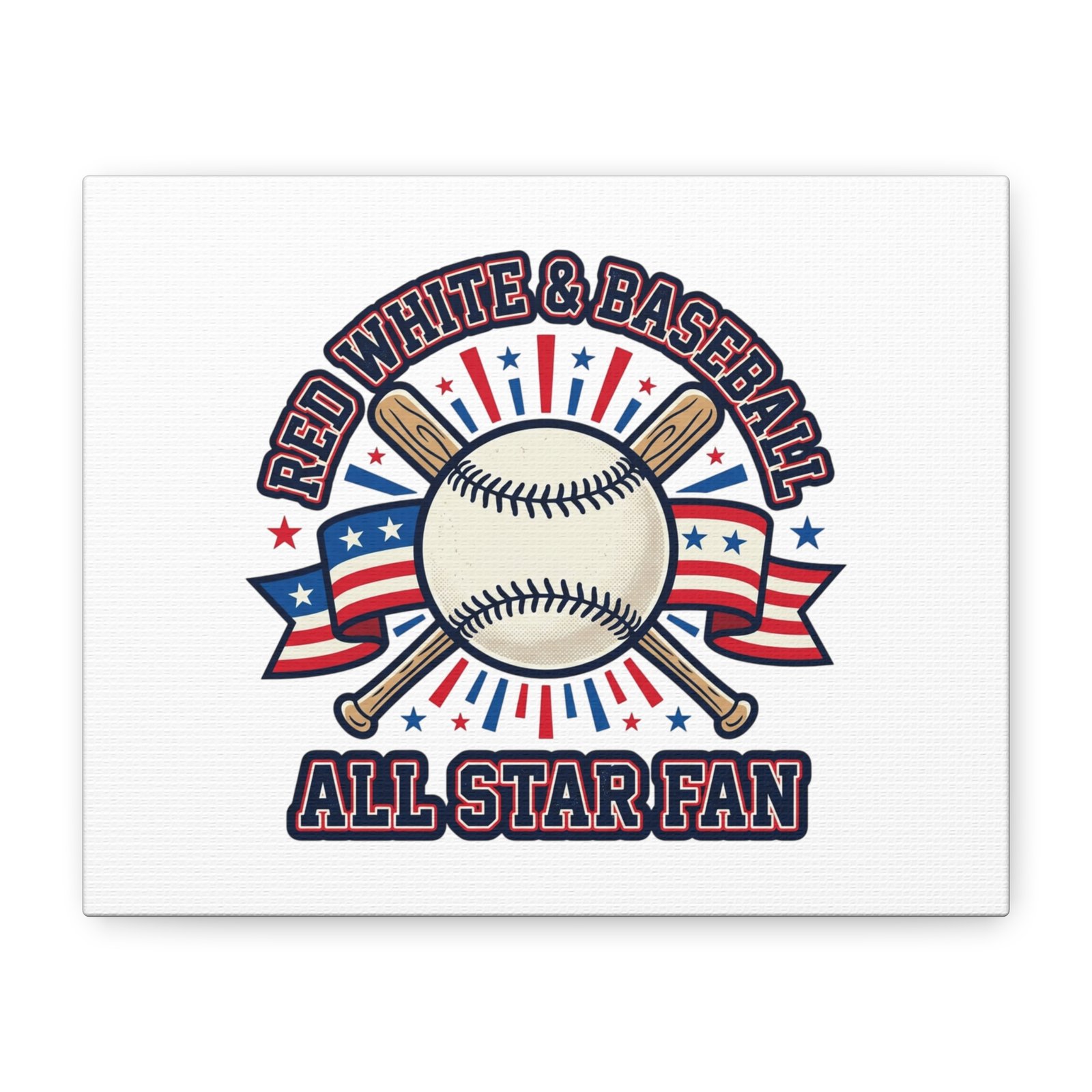 Retro baseball crest printed on matte stretched canvas in a red-white-and-blue palette. The artwork centers on a vintage-style baseball with crossed bats, patriotic ribbon accents and starburst details, channeling a ballpark aesthetic and nostalgic athletic typography. Suited for fans who want a spirited, hometown-game vibe on their wall during baseball season or watch parties. Product features – Unique coating with UL-certified Greenguard Gold inks – Cotton and polyester composite canvas; pine wood frame – Printed with non-hazardous latex inks – Soft rubber dots on bottom back corners for support – Back hanging included; available in multiple orientations and sizes Care instructions – If the canvas does gather any dust, you may wipe it off gently with a clean, damp cloth.