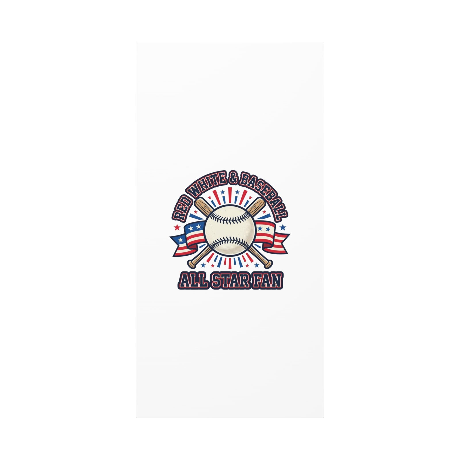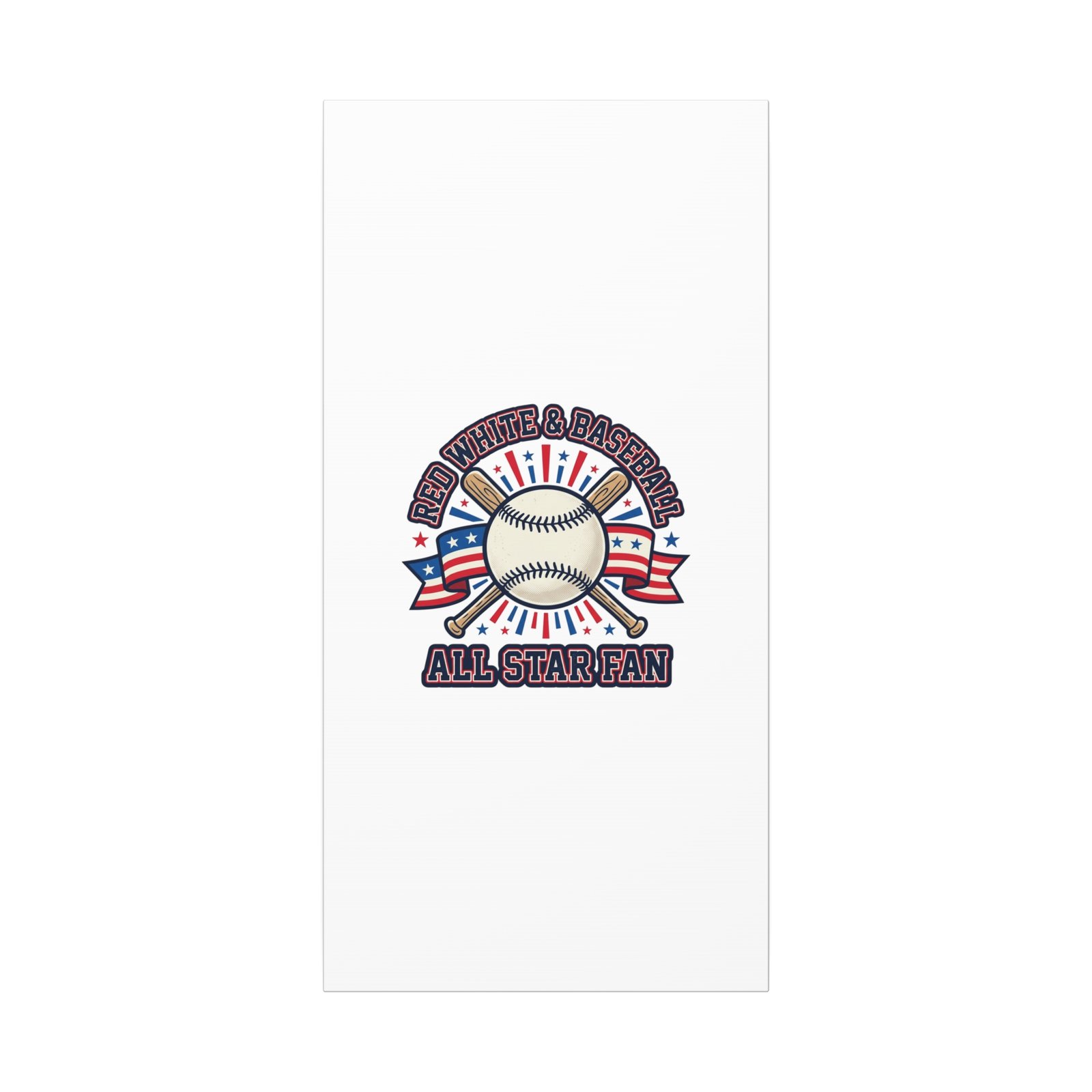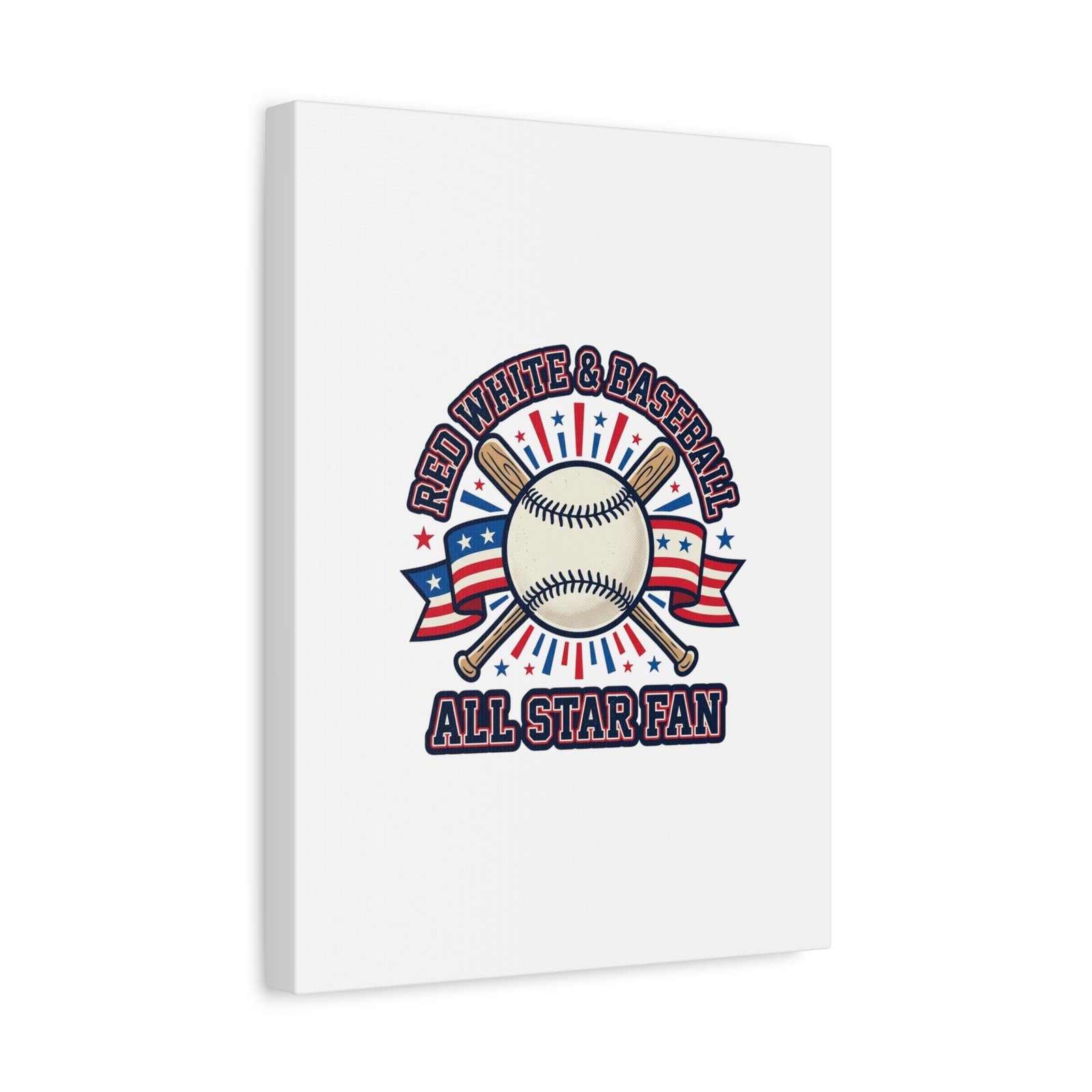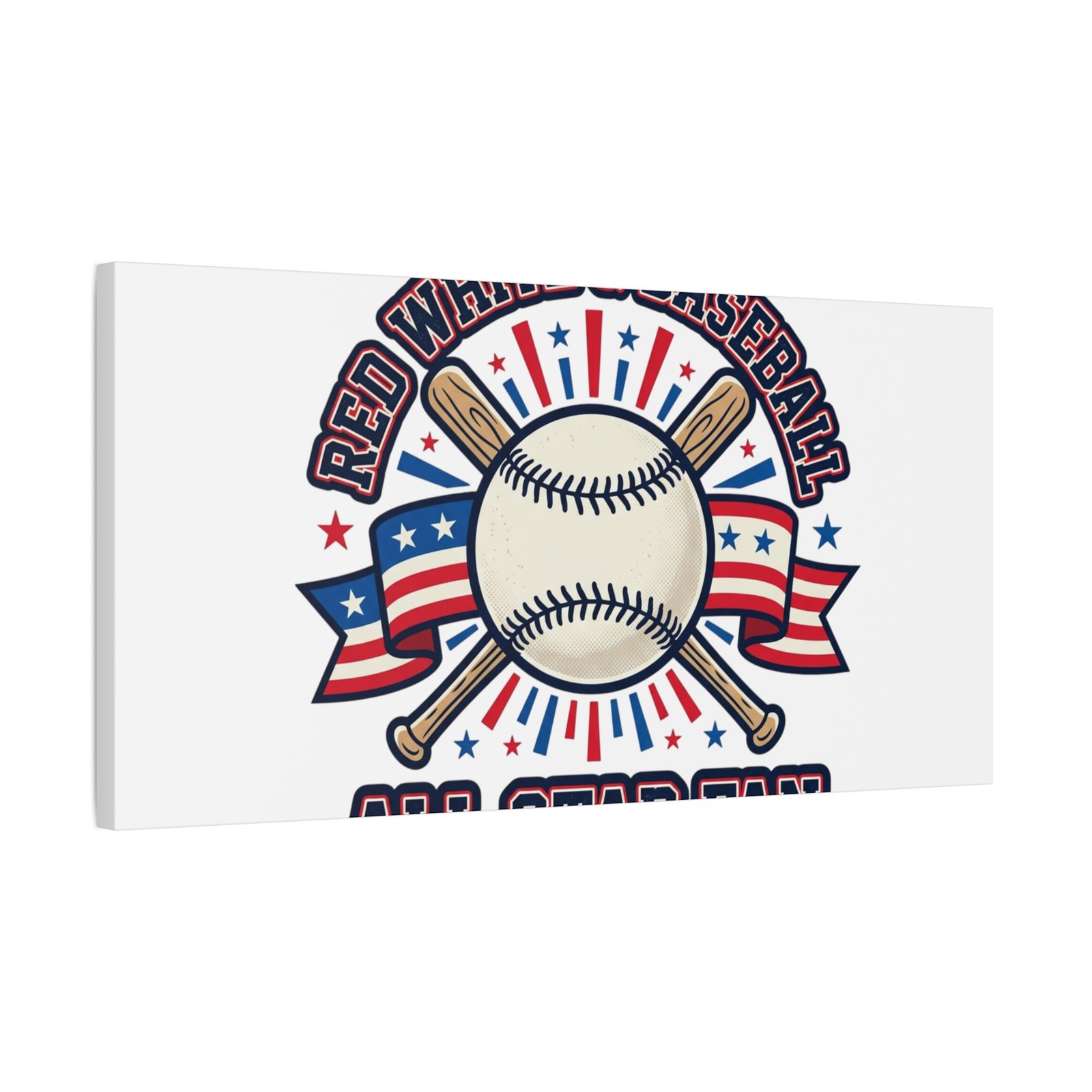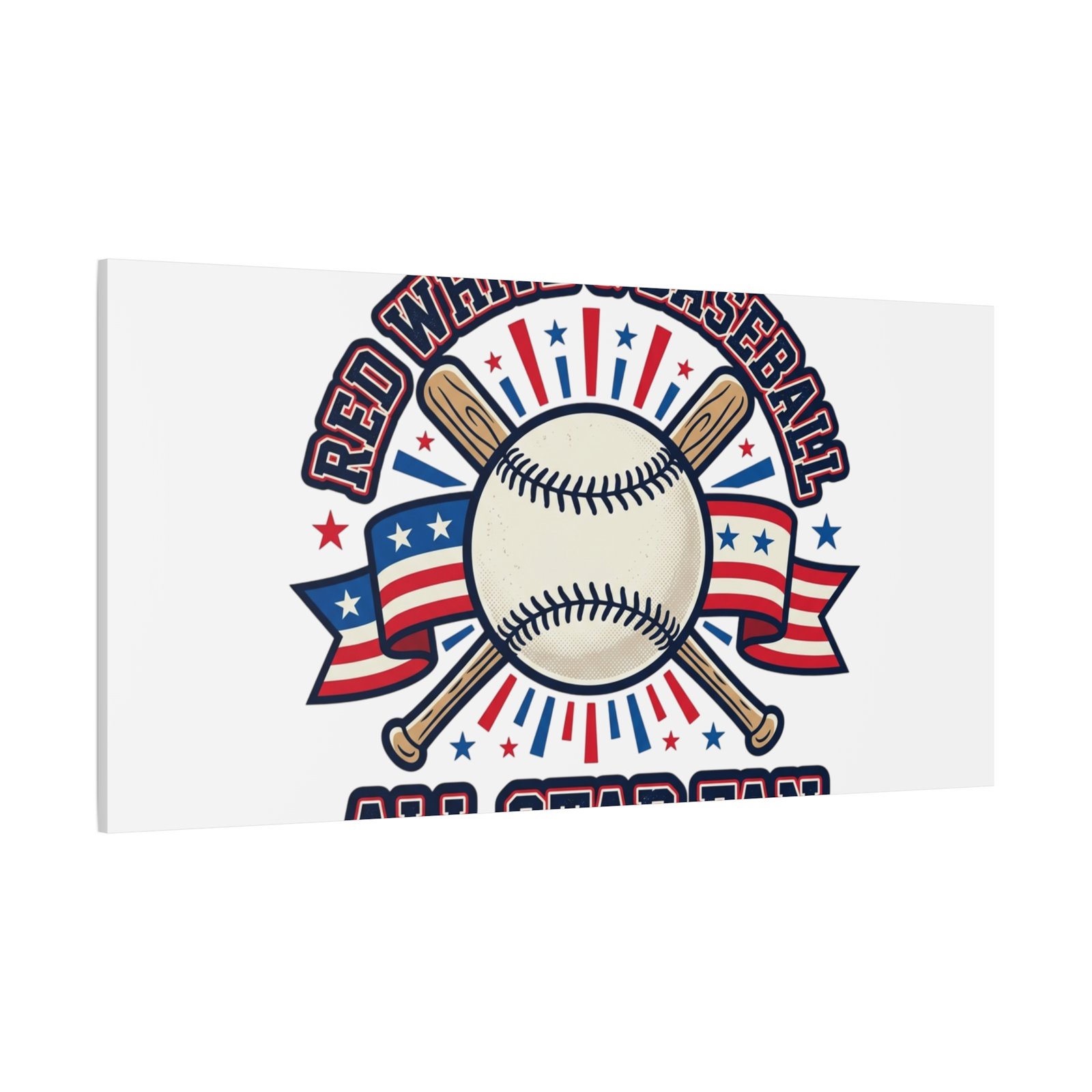 Retro baseball crest printed on matte stretched canvas in a red-white-and-blue palette. The artwork centers on a vintage-style baseball with crossed bats, patriotic ribbon accents and starburst details, channeling a ballpark aesthetic and nostalgic athletic typography. Suited for fans who want a spirited, hometown-game vibe on their wall during baseball season or watch parties. Product features – Unique coating with UL-certified Greenguard Gold inks – Cotton and polyester composite canvas; pine wood frame – Printed with non-hazardous latex inks – Soft rubber dots on bottom back corners for support – Back hanging included; available in multiple orientations and sizes Care instructions – If the canvas does gather any dust, you may wipe it off gently with a clean, damp cloth.