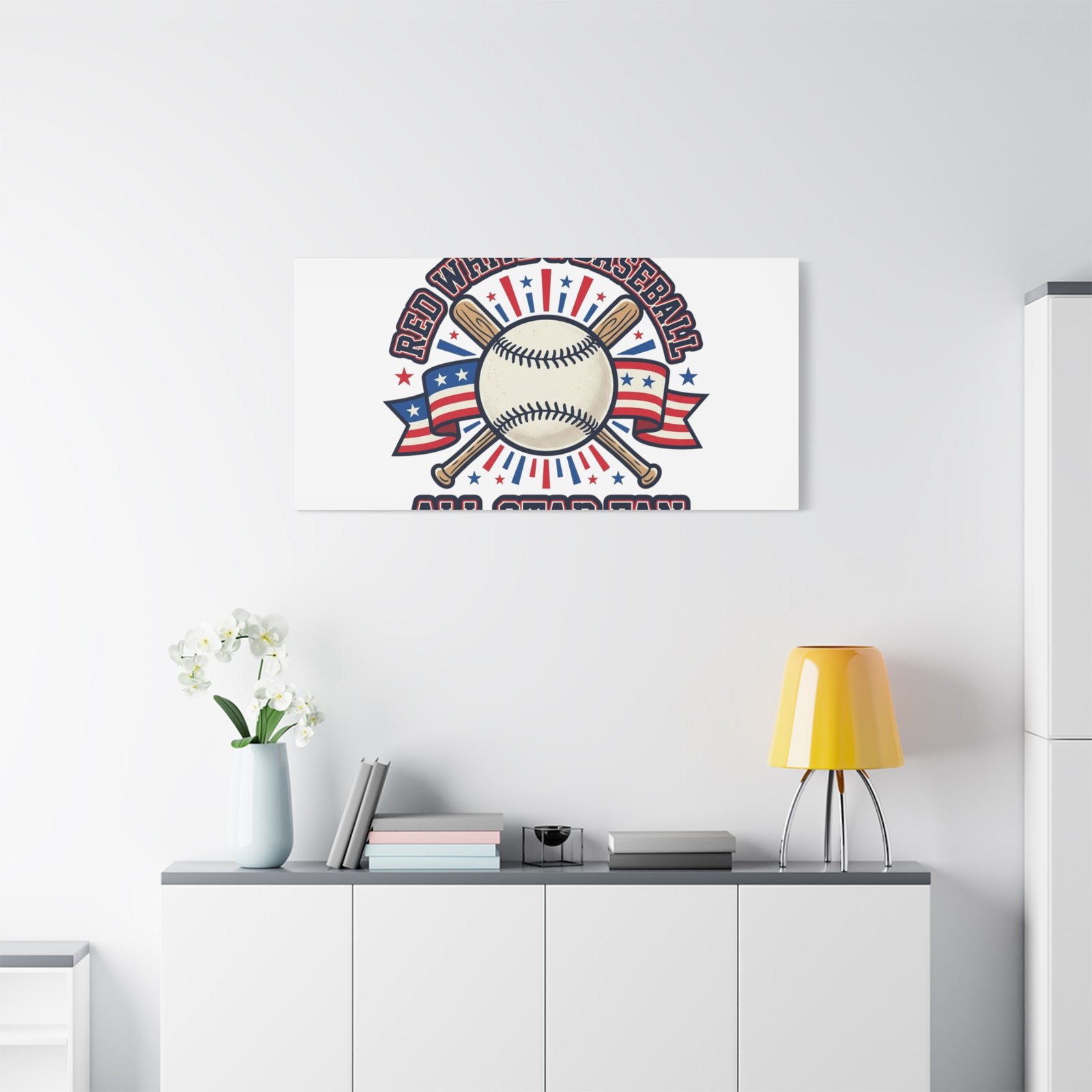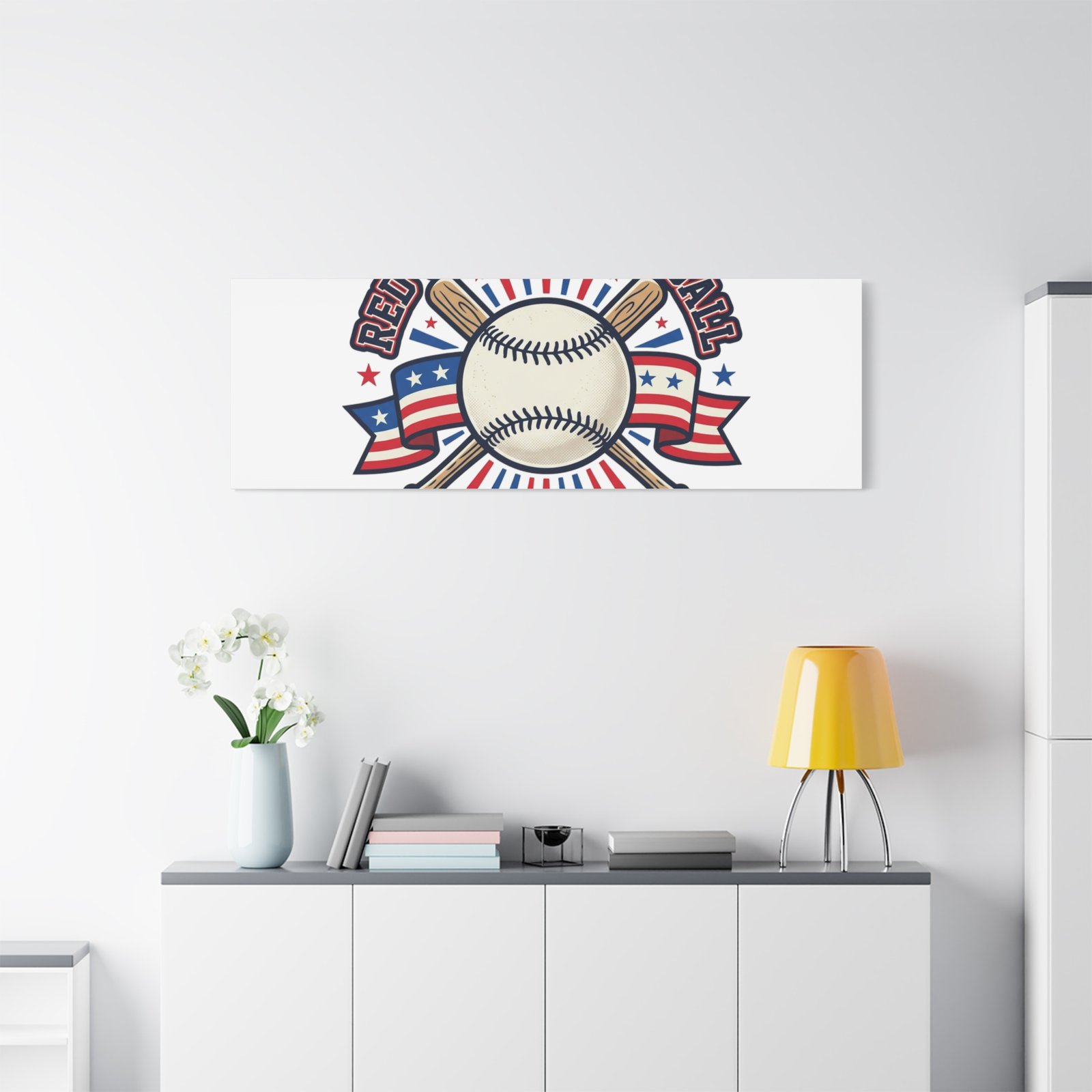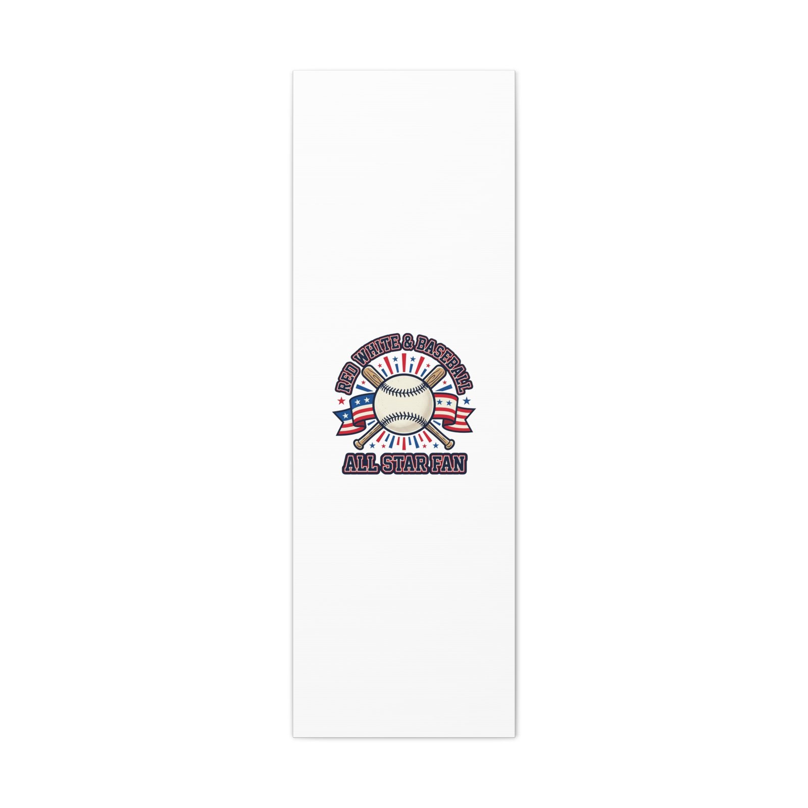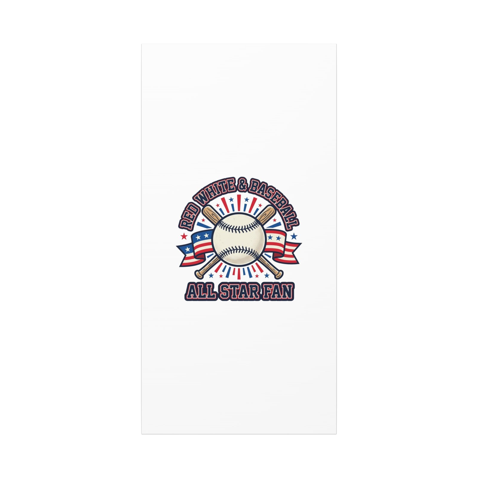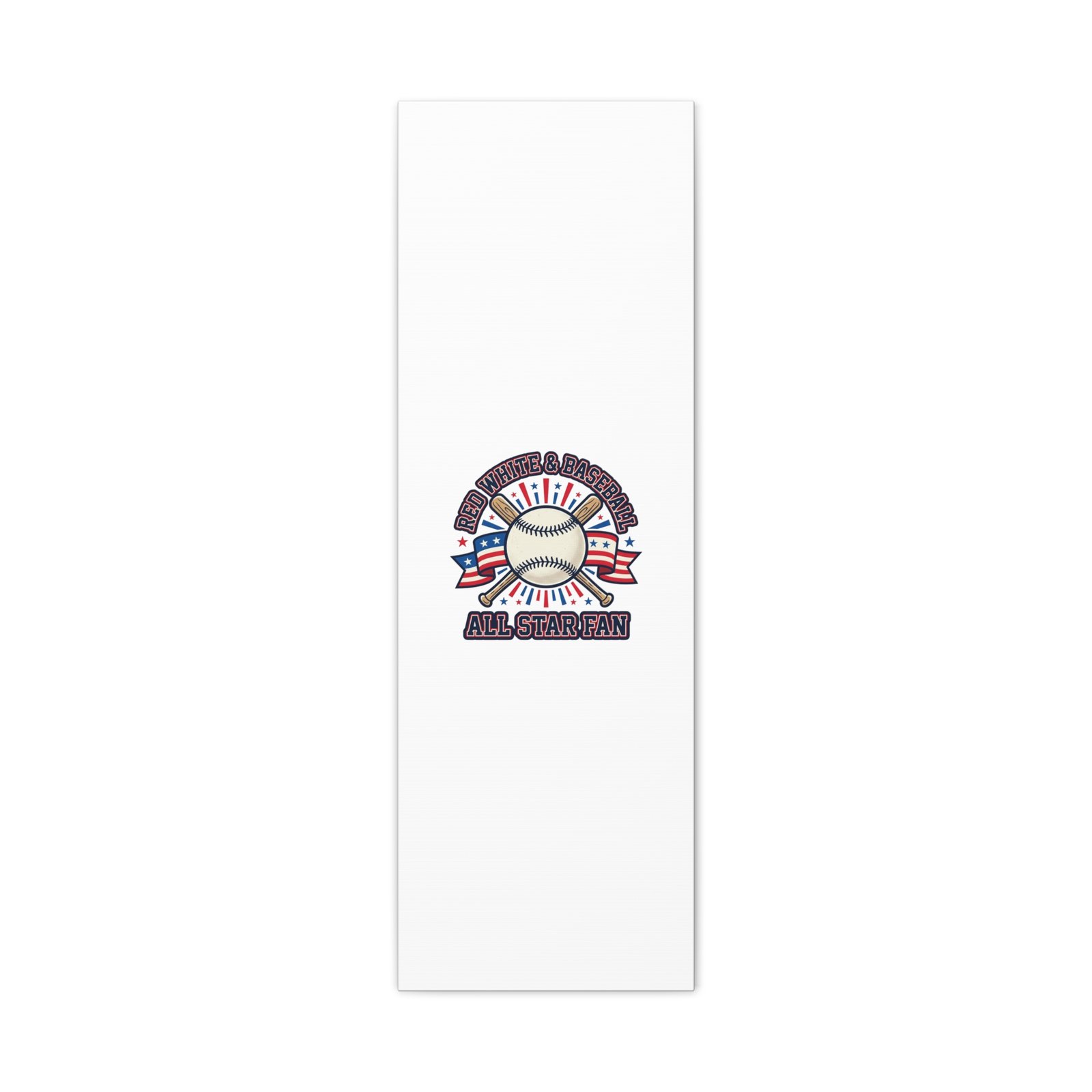 Retro baseball crest printed on matte stretched canvas in a red-white-and-blue palette. The artwork centers on a vintage-style baseball with crossed bats, patriotic ribbon accents and starburst details, channeling a ballpark aesthetic and nostalgic athletic typography. Suited for fans who want a spirited, hometown-game vibe on their wall during baseball season or watch parties. Product features – Unique coating with UL-certified Greenguard Gold inks – Cotton and polyester composite canvas; pine wood frame – Printed with non-hazardous latex inks – Soft rubber dots on bottom back corners for support – Back hanging included; available in multiple orientations and sizes Care instructions – If the canvas does gather any dust, you may wipe it off gently with a clean, damp cloth.