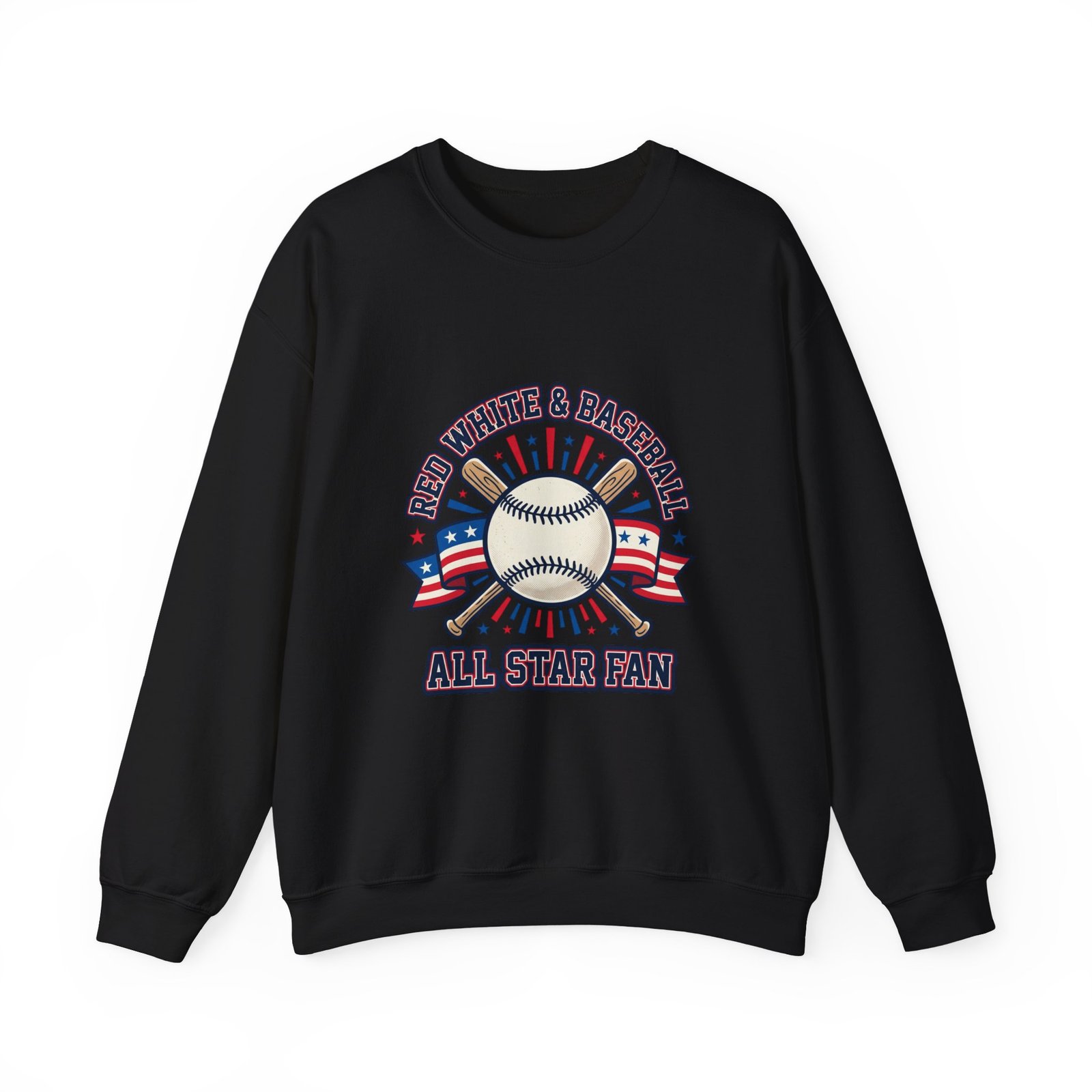 Vintage-inspired crewneck sweatshirt featuring a retro athletic graphic: a central baseball with crossed bats, stylized stars and ribbons in red, white, and blue, and bold sports typography reading an all-star fan message. The artwork channels a patriotic baseball fan aesthetic—nostalgic, energetic, and stadium-ready—on a medium-weight, tubular-knit sweatshirt for a clean, structured look. Wear it to games, watch parties, or casual days when you want a classic ballpark vibe that highlights national pride without specific team marks. Product features – Embroidery available at left chest, center chest, large center chest, and both wrists – Made in Nicaragua – Adult sizes only – Gildan 18000: 50/50 cotton-poly, 8.0 oz/yd² (271 g/m²), no side seams (tubular knit) – DTF inner neck labels and wrist prints; DTG for other prints Care instructions – Machine wash: cold (max 30C or 90F) – Non-chlorine: bleach as needed – Tumble dry: low heat – Do not dryclean –
