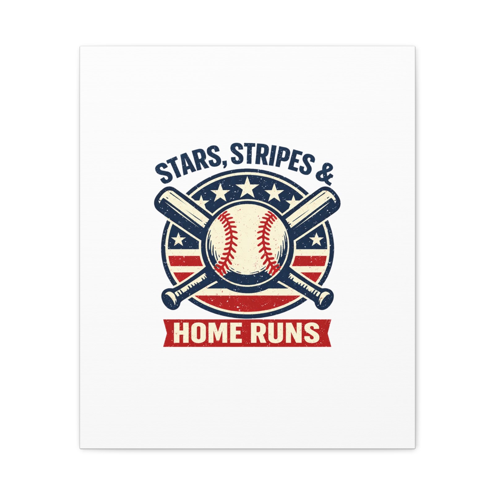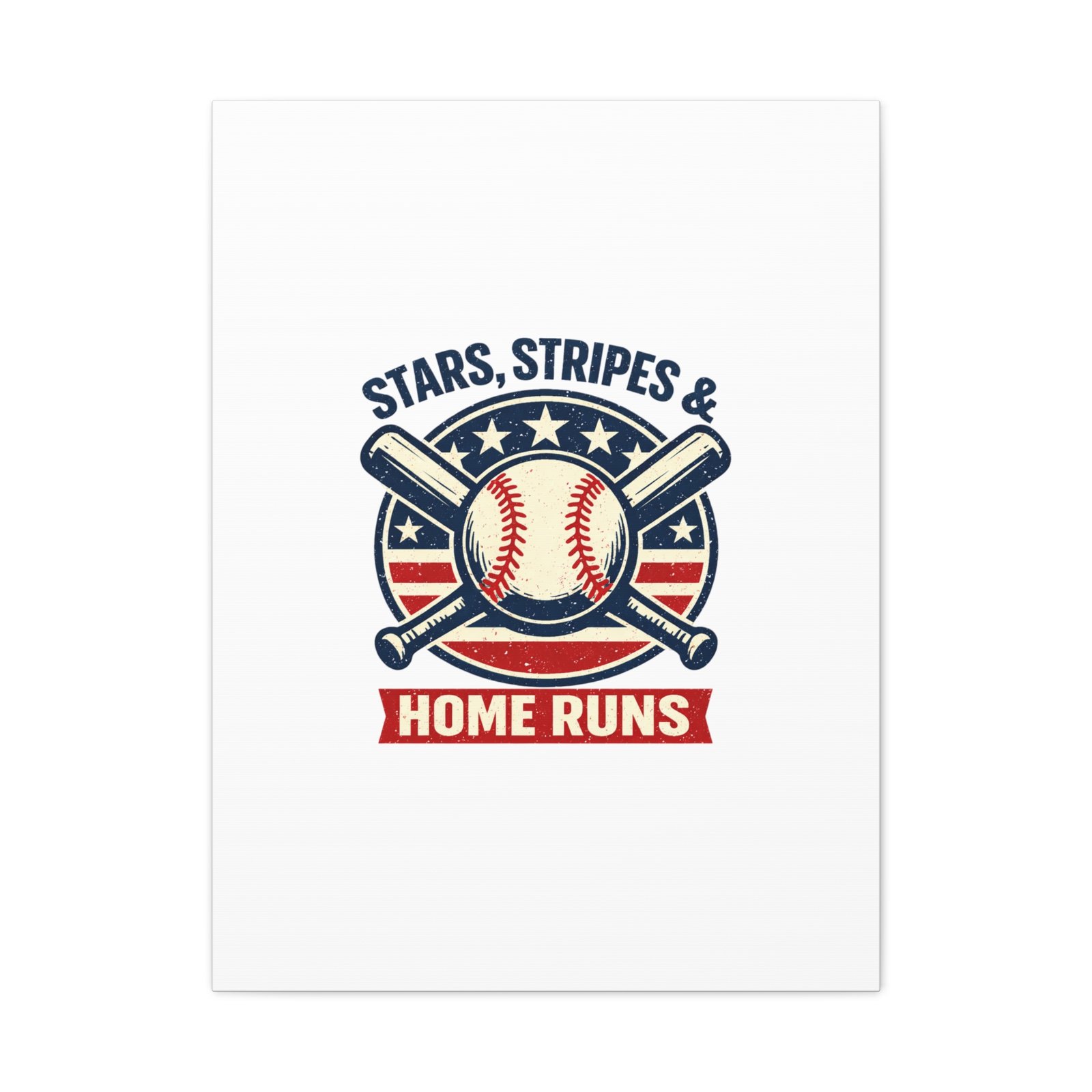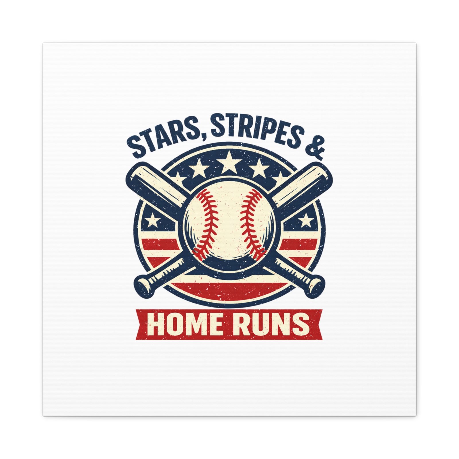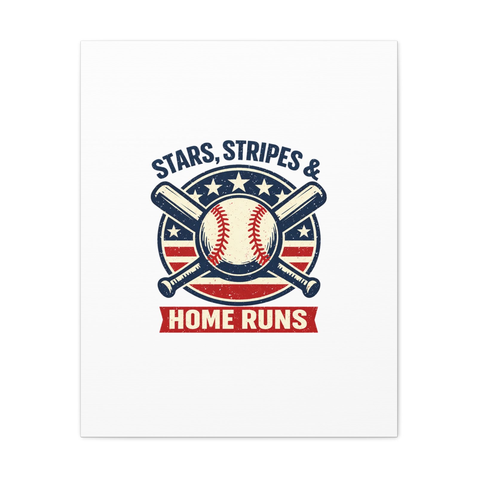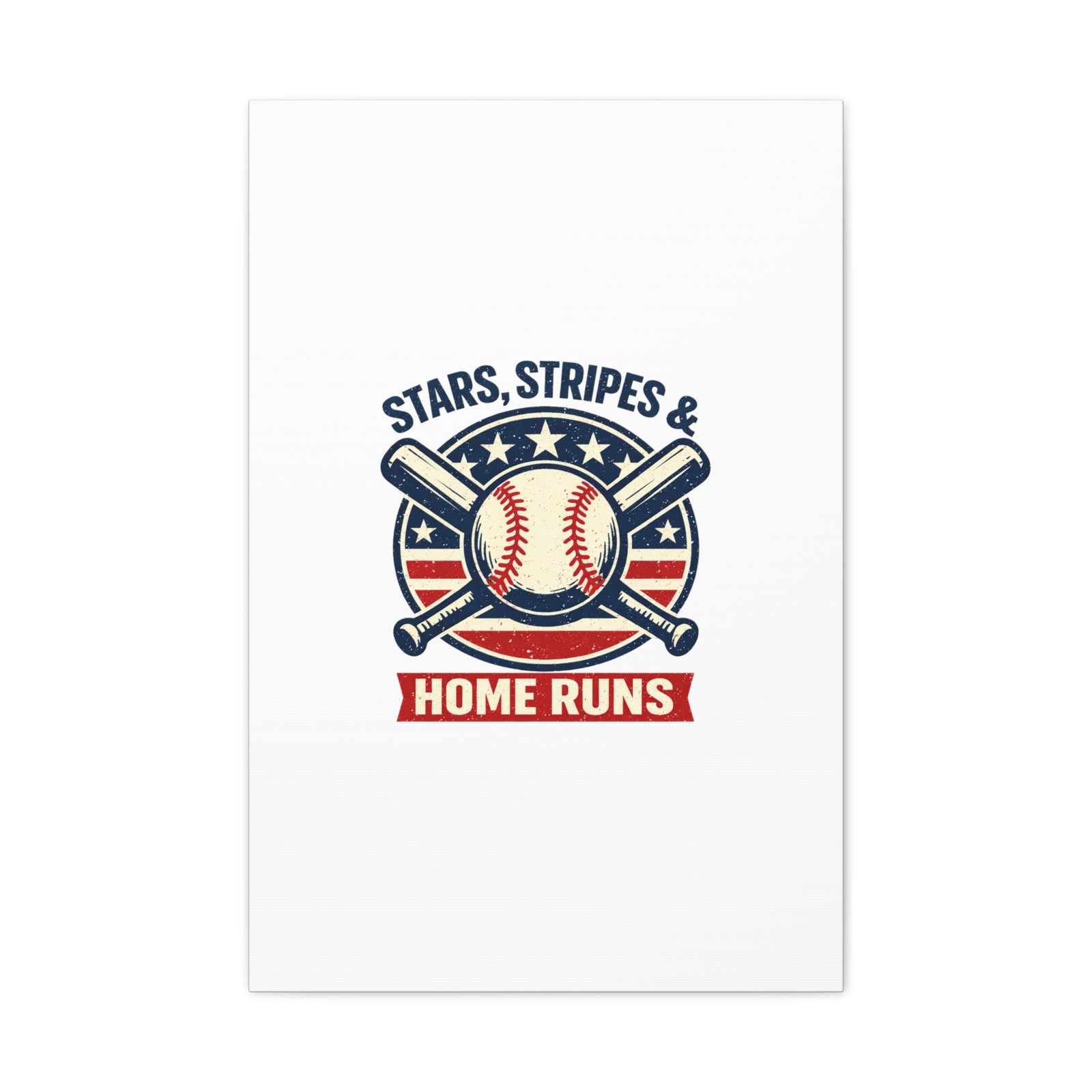 Vintage-inspired baseball emblem printed on matte stretched canvas, blending red, white and blue athletic typography with a weathered diamond motif. The artwork pairs crossed bats and a stitched ball over a striped star field for a ballpark-ready, patriotic vibe that fits the ‘Patriotic Baseball Fan Aesthetic’—nostalgic, competitive, and proudly sport-forward. Hang in a fan cave, office, or entryway to signal national pride and classic baseball spirit during season and watch parties.
