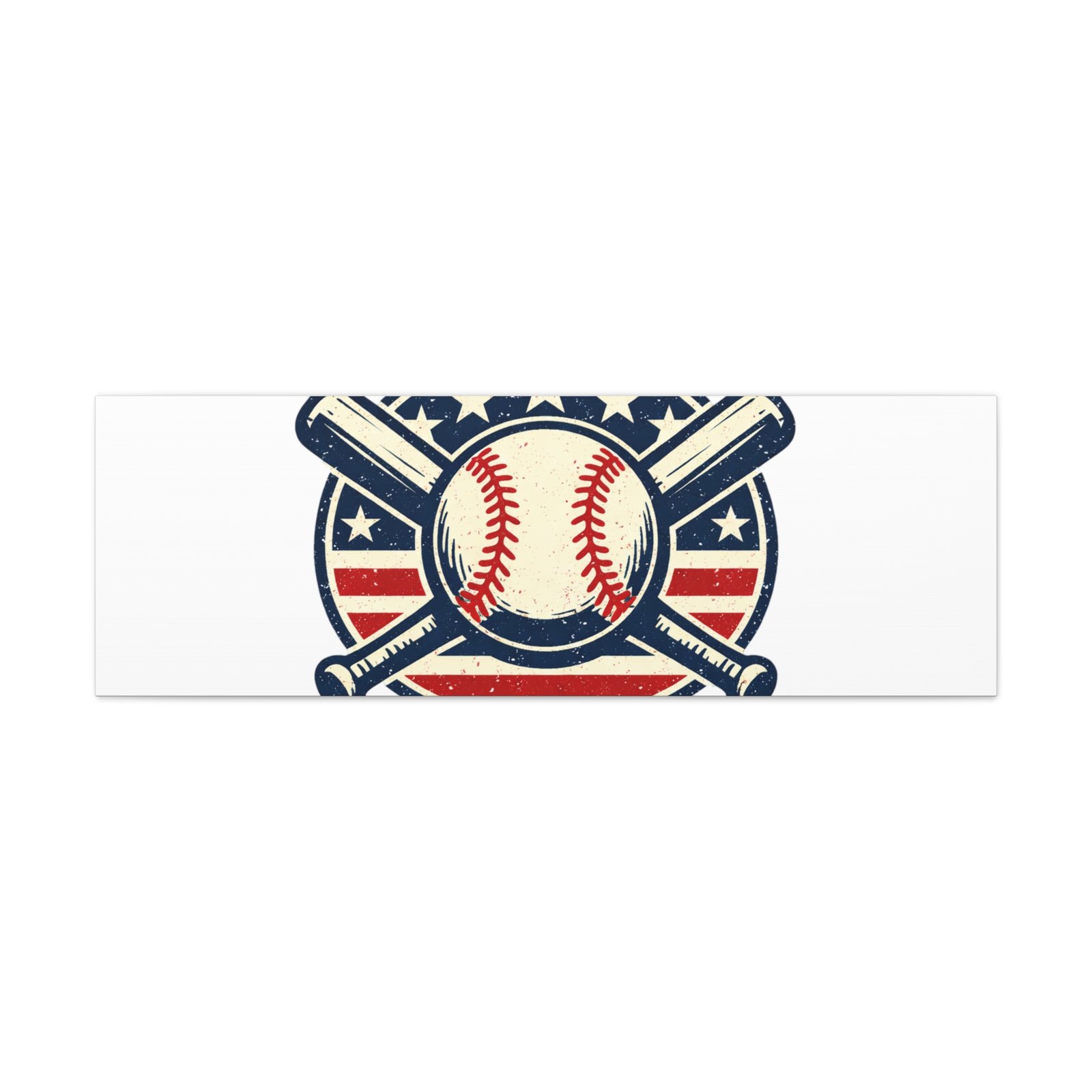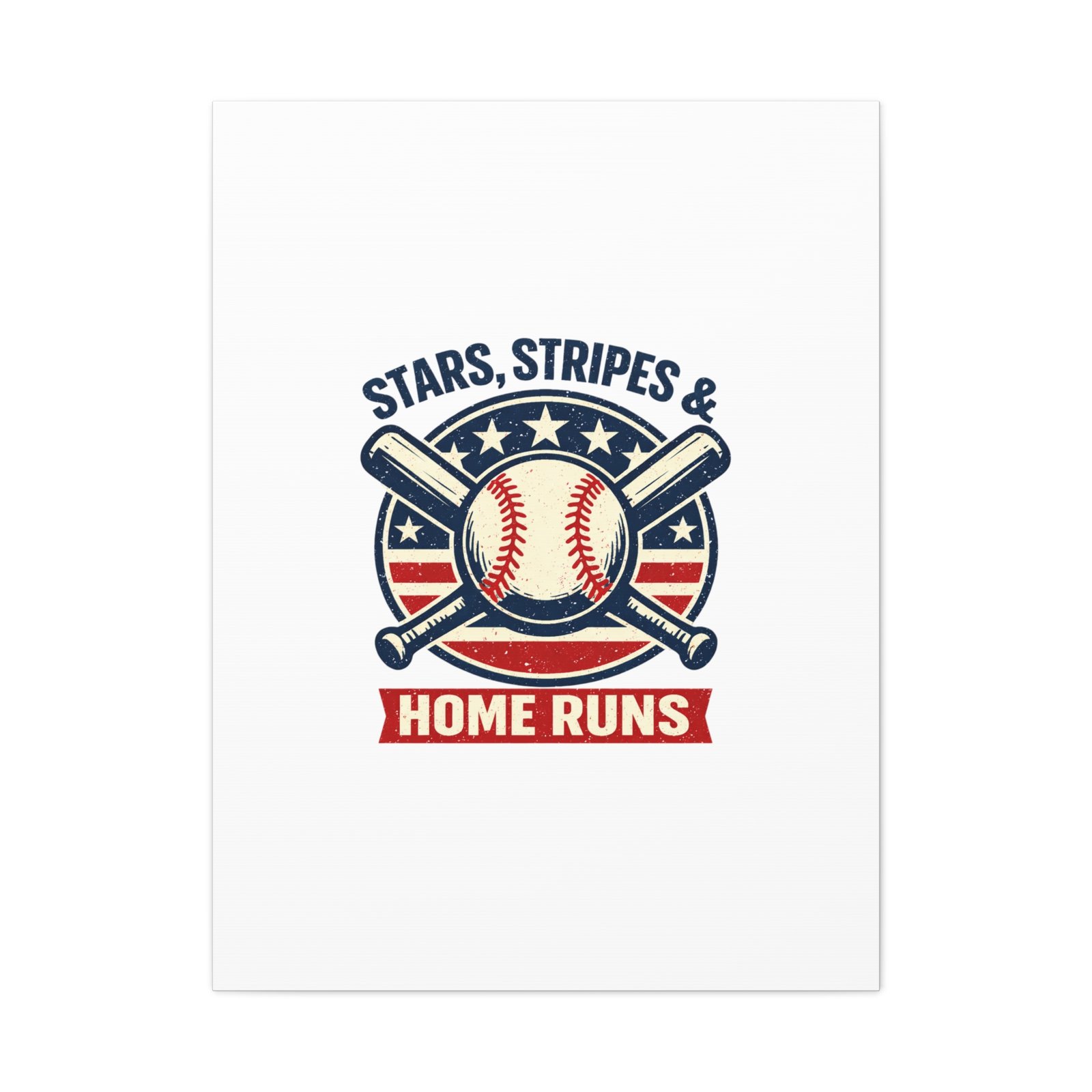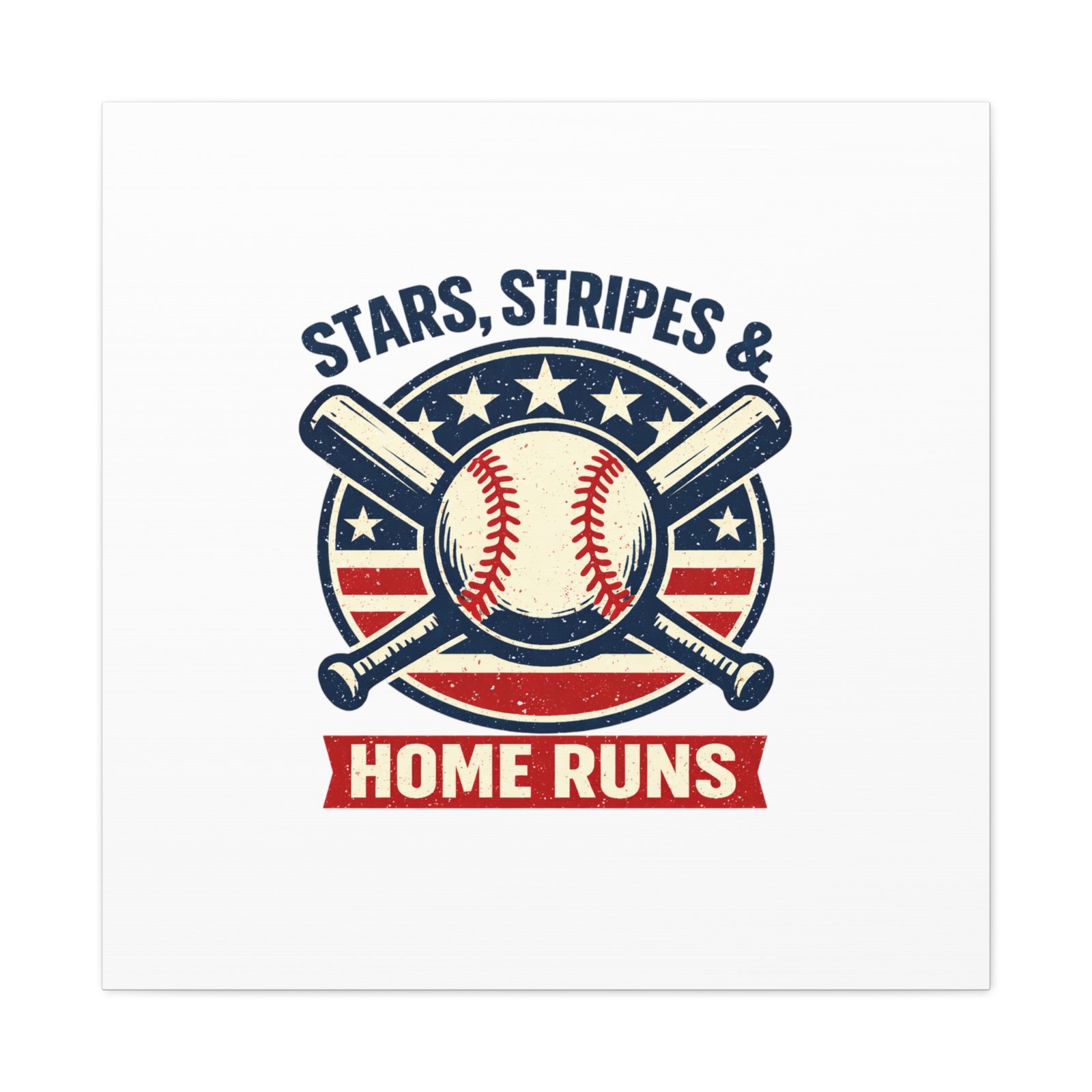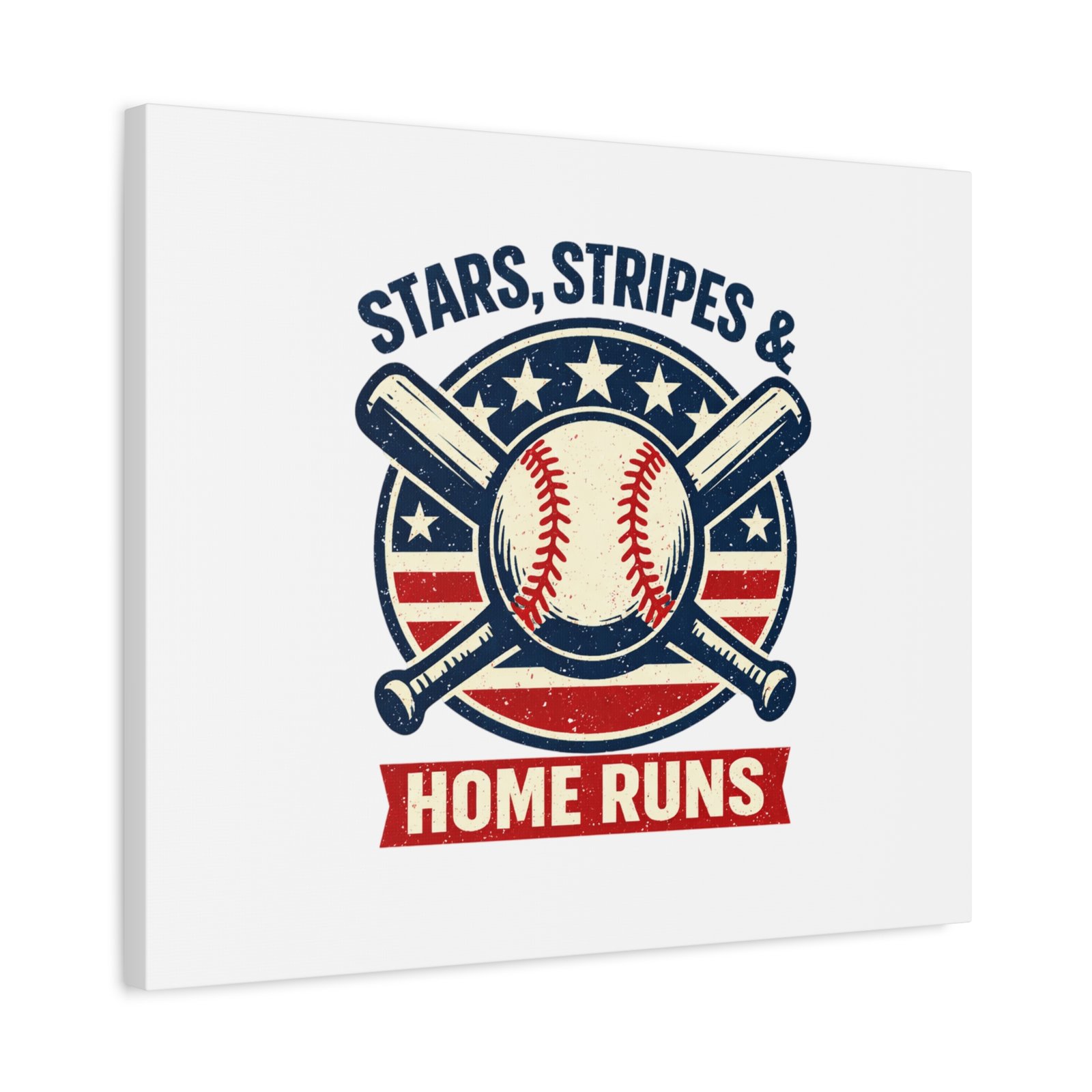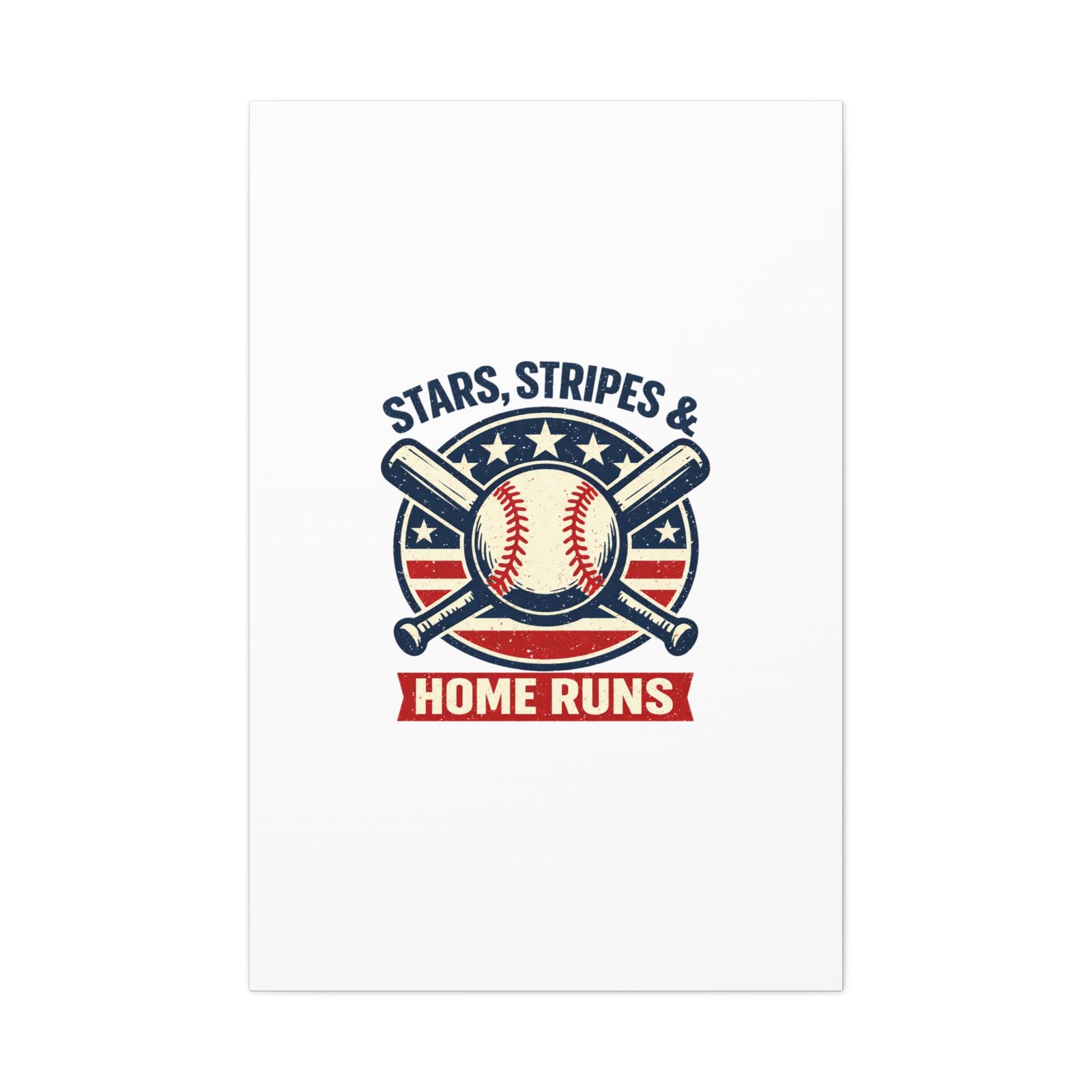 Vintage-inspired baseball emblem printed on matte stretched canvas, blending red, white and blue athletic typography with a weathered diamond motif. The artwork pairs crossed bats and a stitched ball over a striped star field for a ballpark-ready, patriotic vibe that fits the ‘Patriotic Baseball Fan Aesthetic’—nostalgic, competitive, and proudly sport-forward. Hang in a fan cave, office, or entryway to signal national pride and classic baseball spirit during season and watch parties.