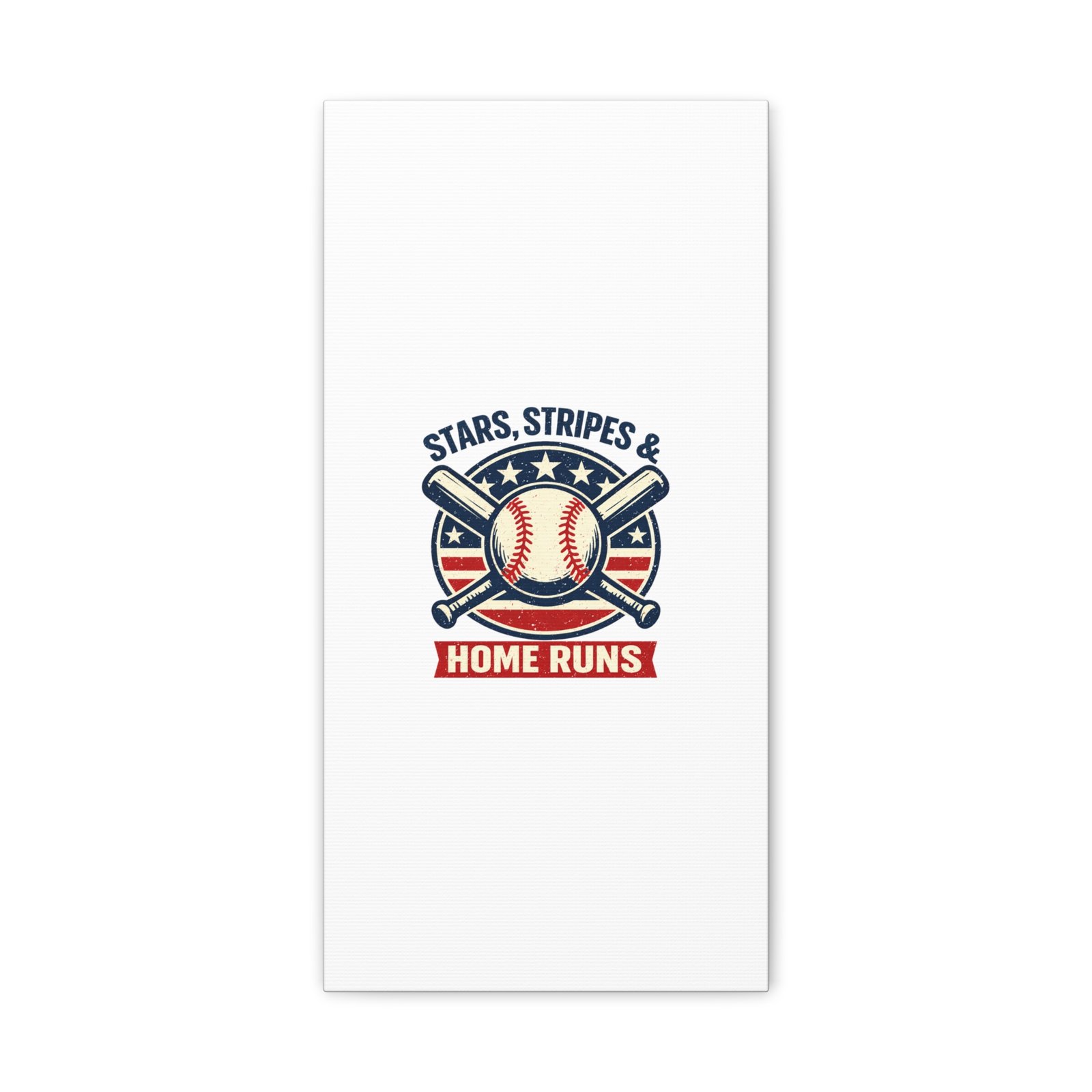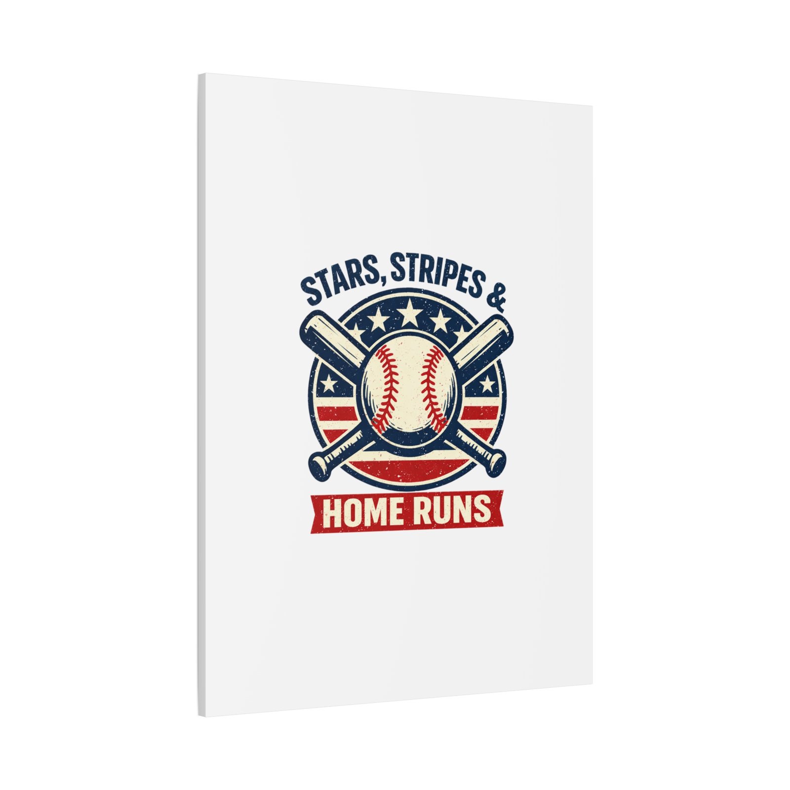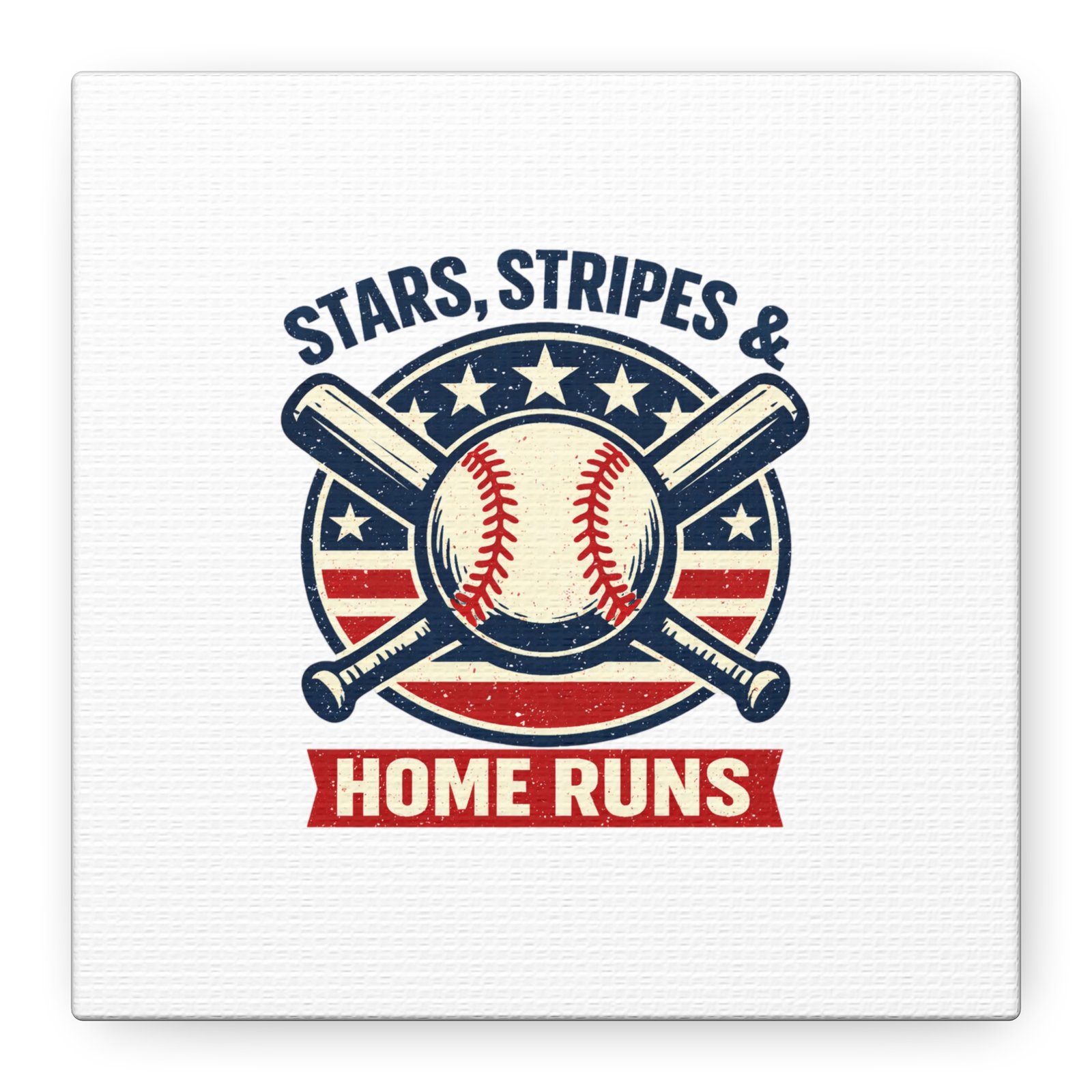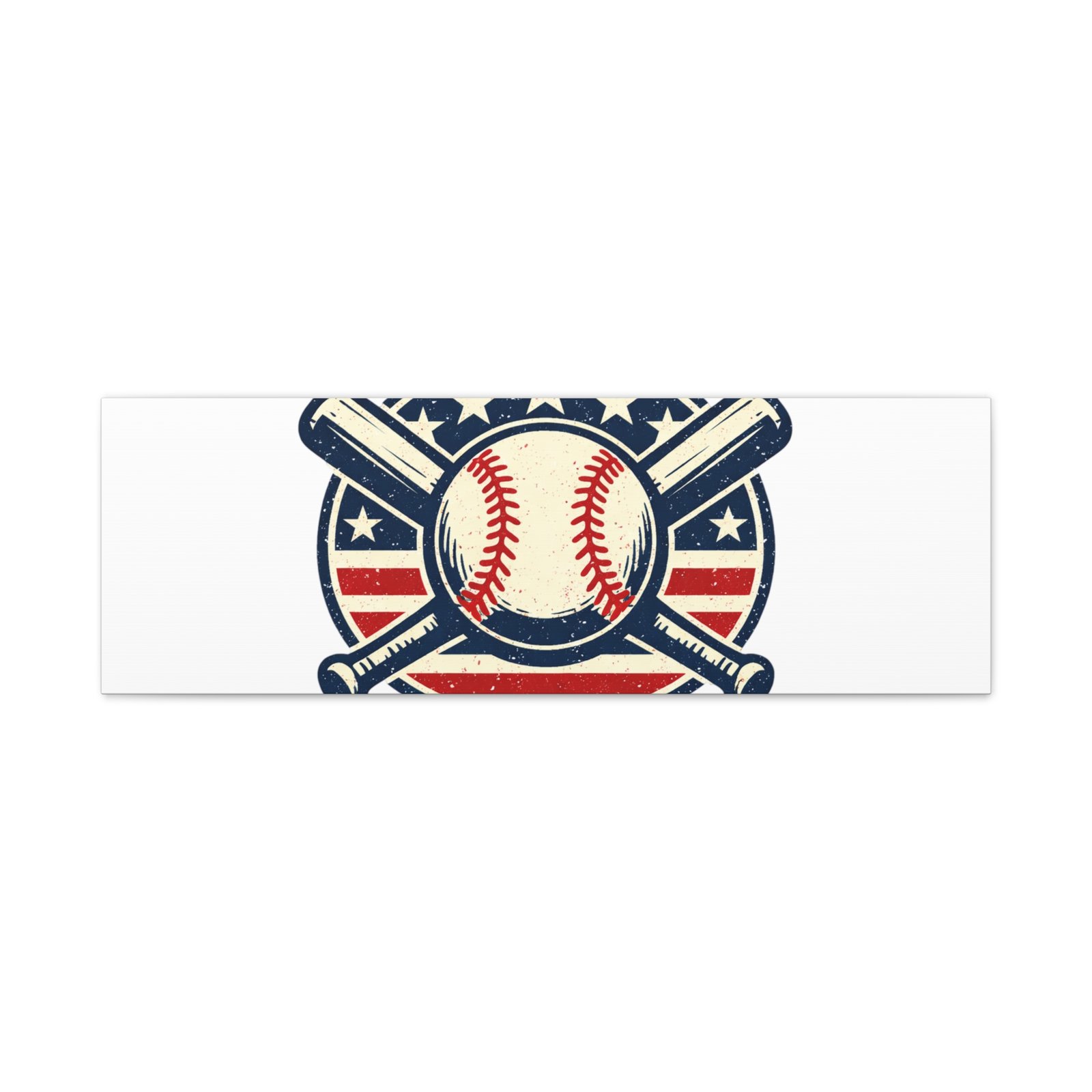 Vintage-inspired baseball emblem printed on matte stretched canvas, blending red, white and blue athletic typography with a weathered diamond motif. The artwork pairs crossed bats and a stitched ball over a striped star field for a ballpark-ready, patriotic vibe that fits the ‘Patriotic Baseball Fan Aesthetic’—nostalgic, competitive, and proudly sport-forward. Hang in a fan cave, office, or entryway to signal national pride and classic baseball spirit during season and watch parties.