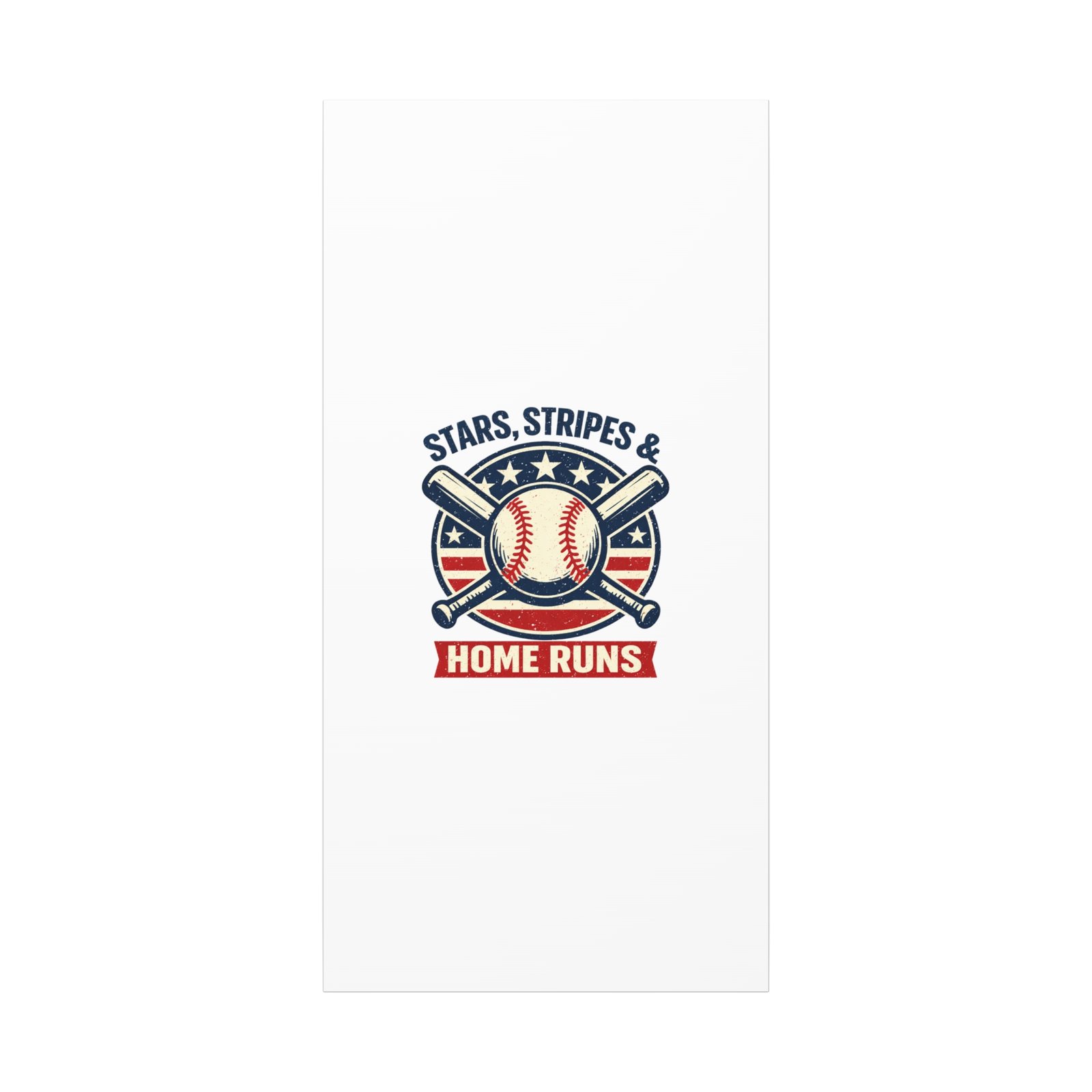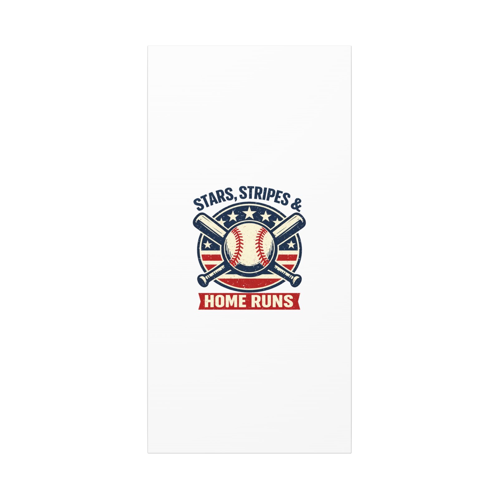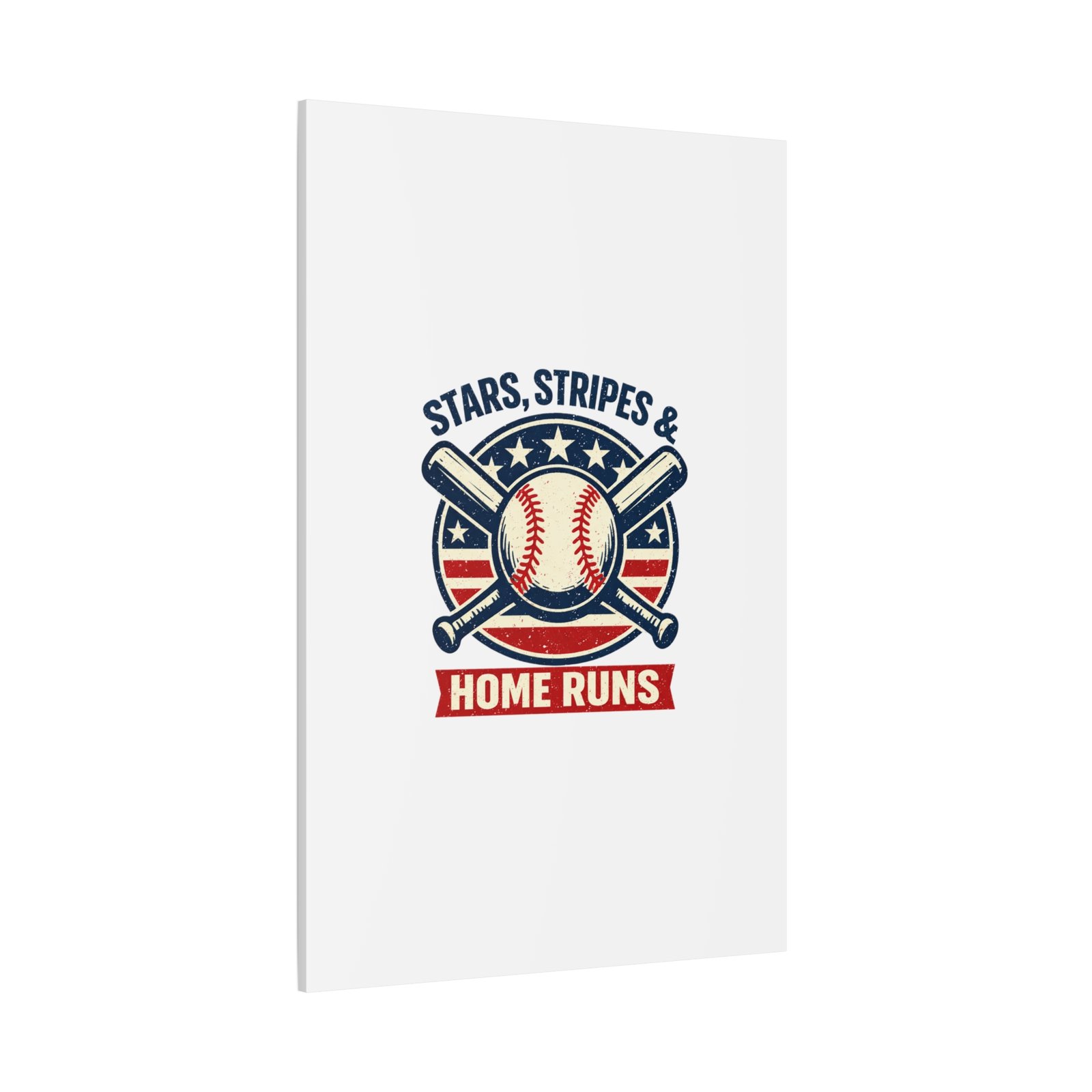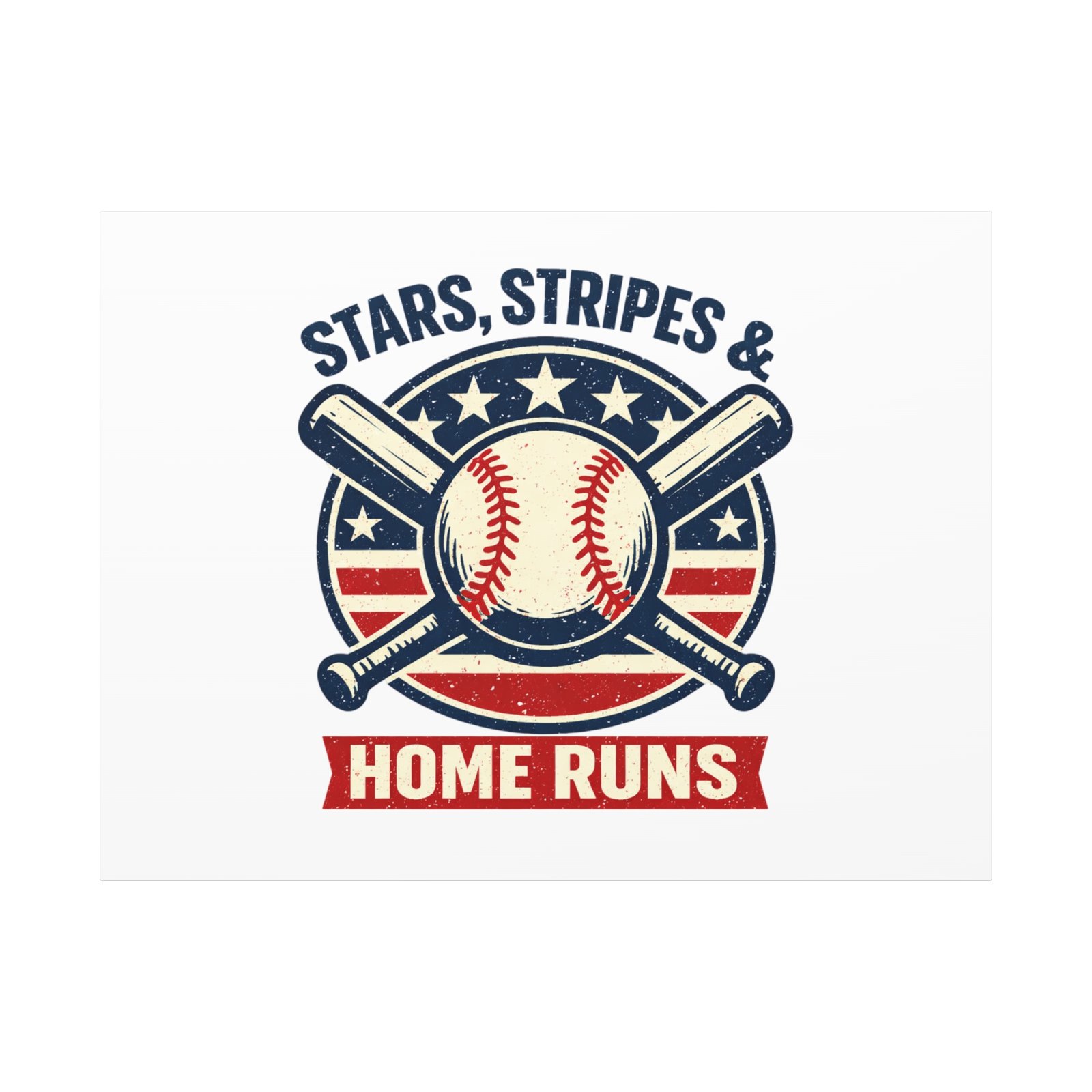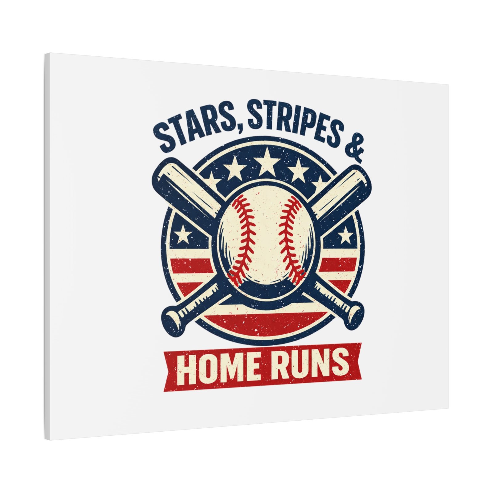 Vintage-inspired baseball emblem printed on matte stretched canvas, blending red, white and blue athletic typography with a weathered diamond motif. The artwork pairs crossed bats and a stitched ball over a striped star field for a ballpark-ready, patriotic vibe that fits the ‘Patriotic Baseball Fan Aesthetic’—nostalgic, competitive, and proudly sport-forward. Hang in a fan cave, office, or entryway to signal national pride and classic baseball spirit during season and watch parties.