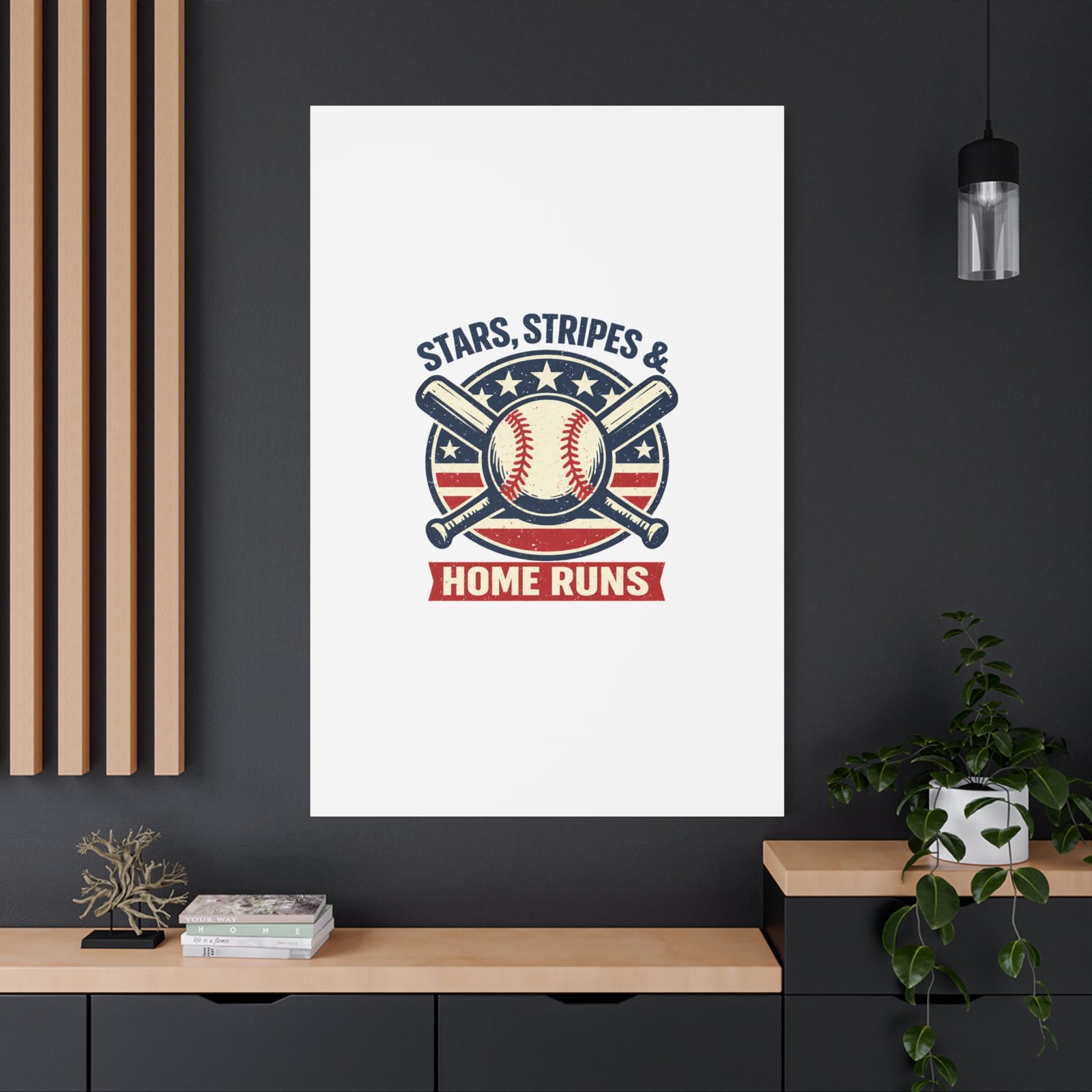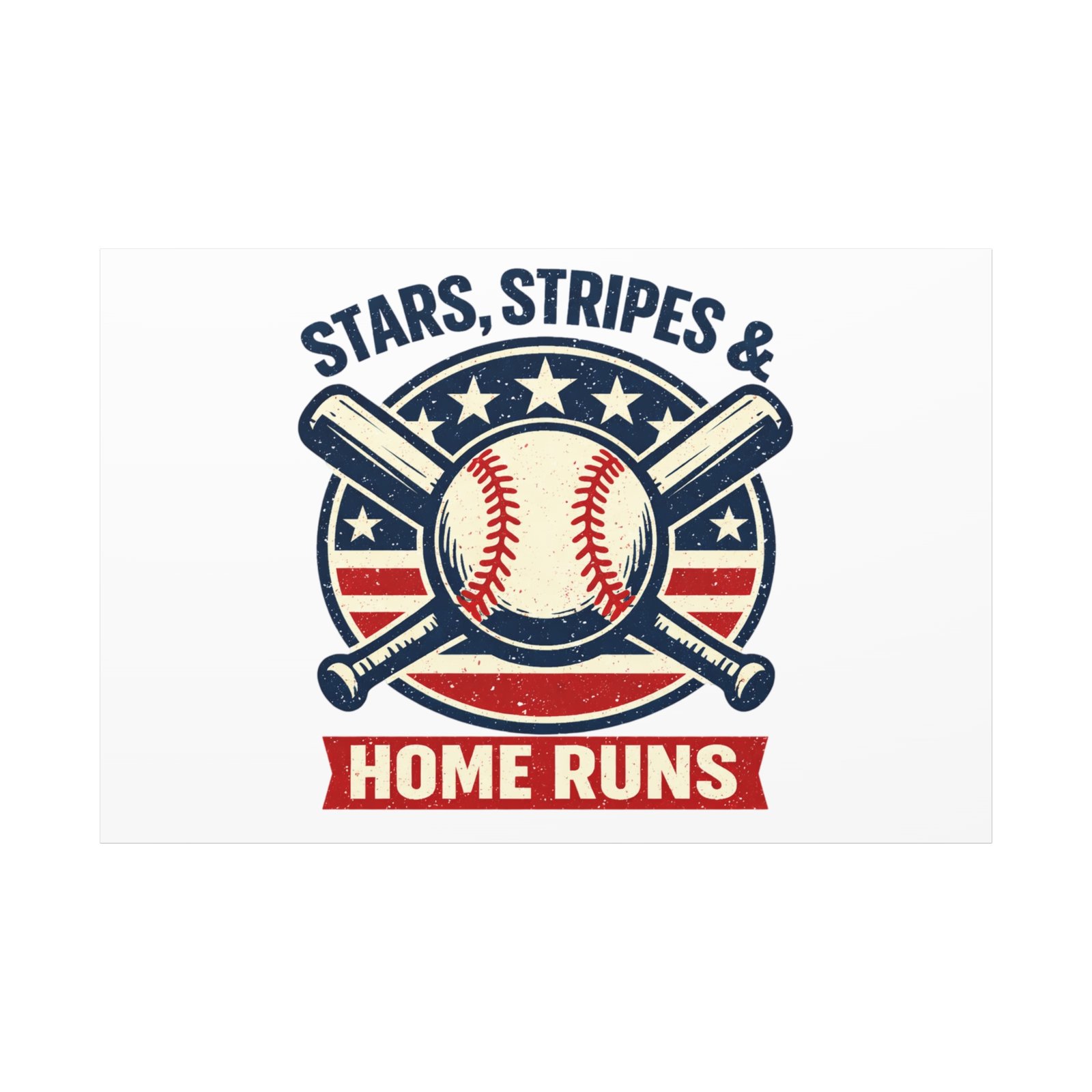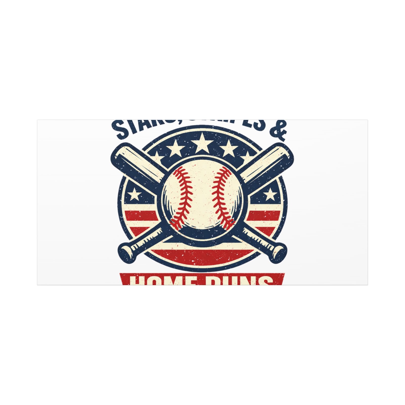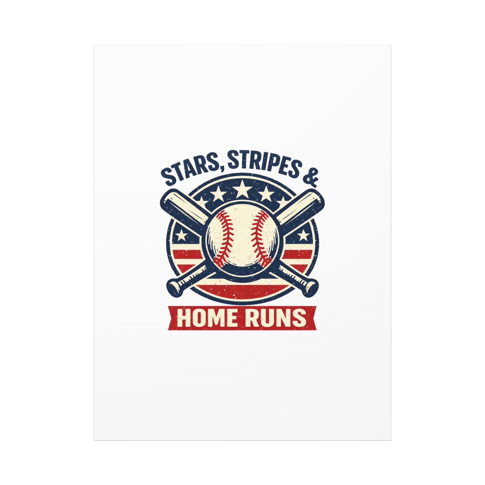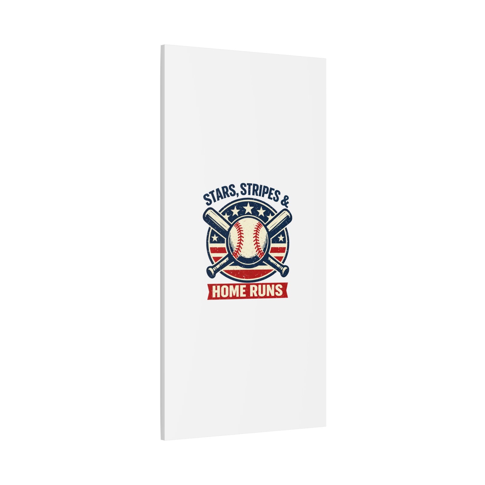 Vintage-inspired baseball emblem printed on matte stretched canvas, blending red, white and blue athletic typography with a weathered diamond motif. The artwork pairs crossed bats and a stitched ball over a striped star field for a ballpark-ready, patriotic vibe that fits the ‘Patriotic Baseball Fan Aesthetic’—nostalgic, competitive, and proudly sport-forward. Hang in a fan cave, office, or entryway to signal national pride and classic baseball spirit during season and watch parties.