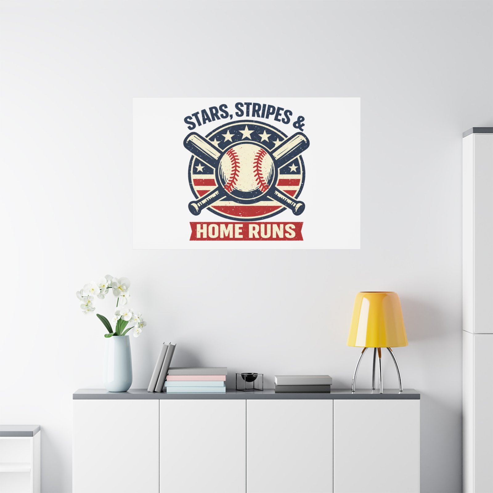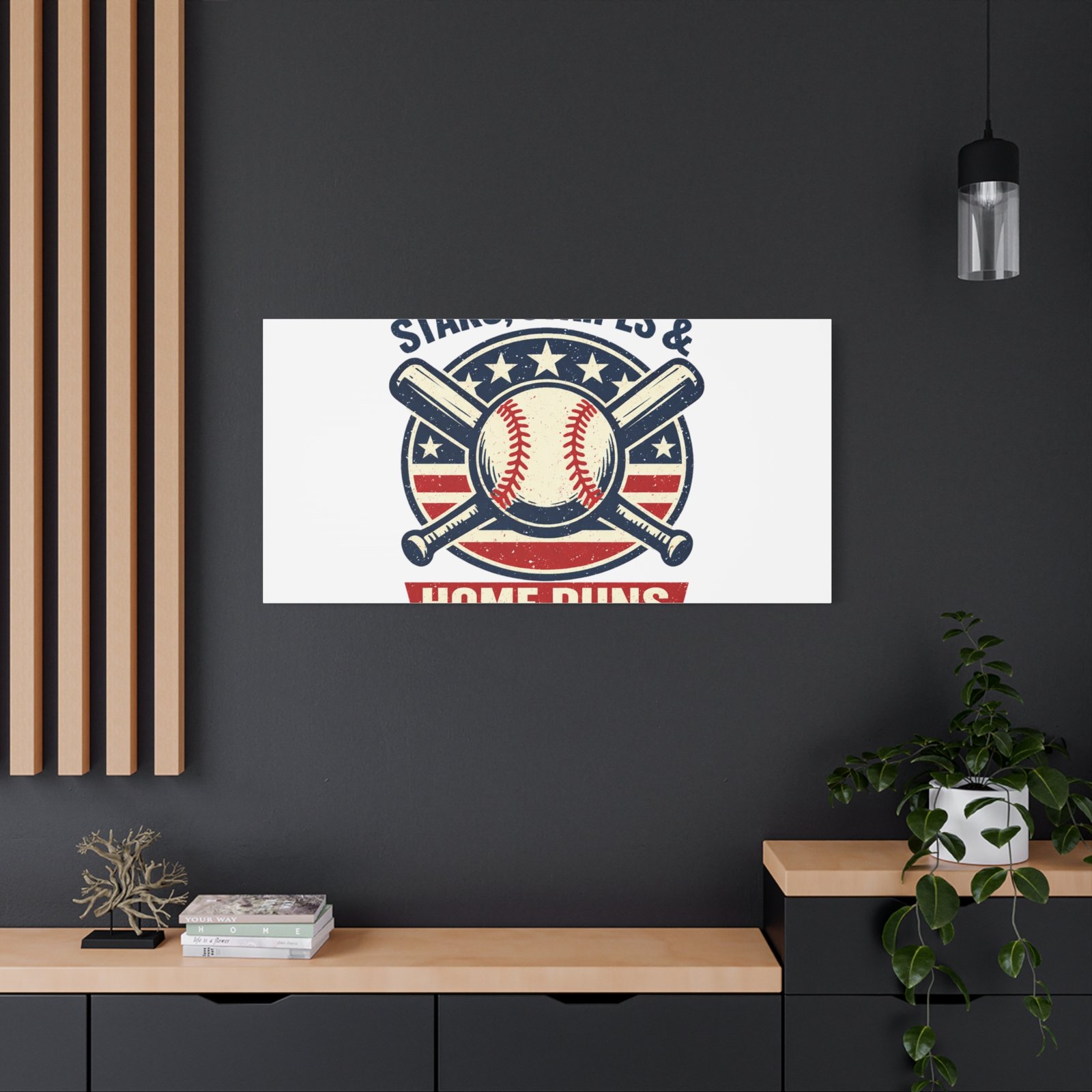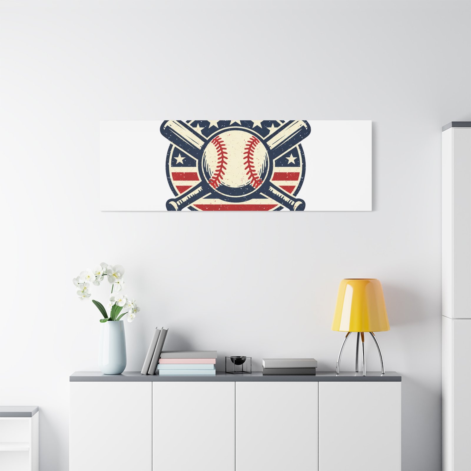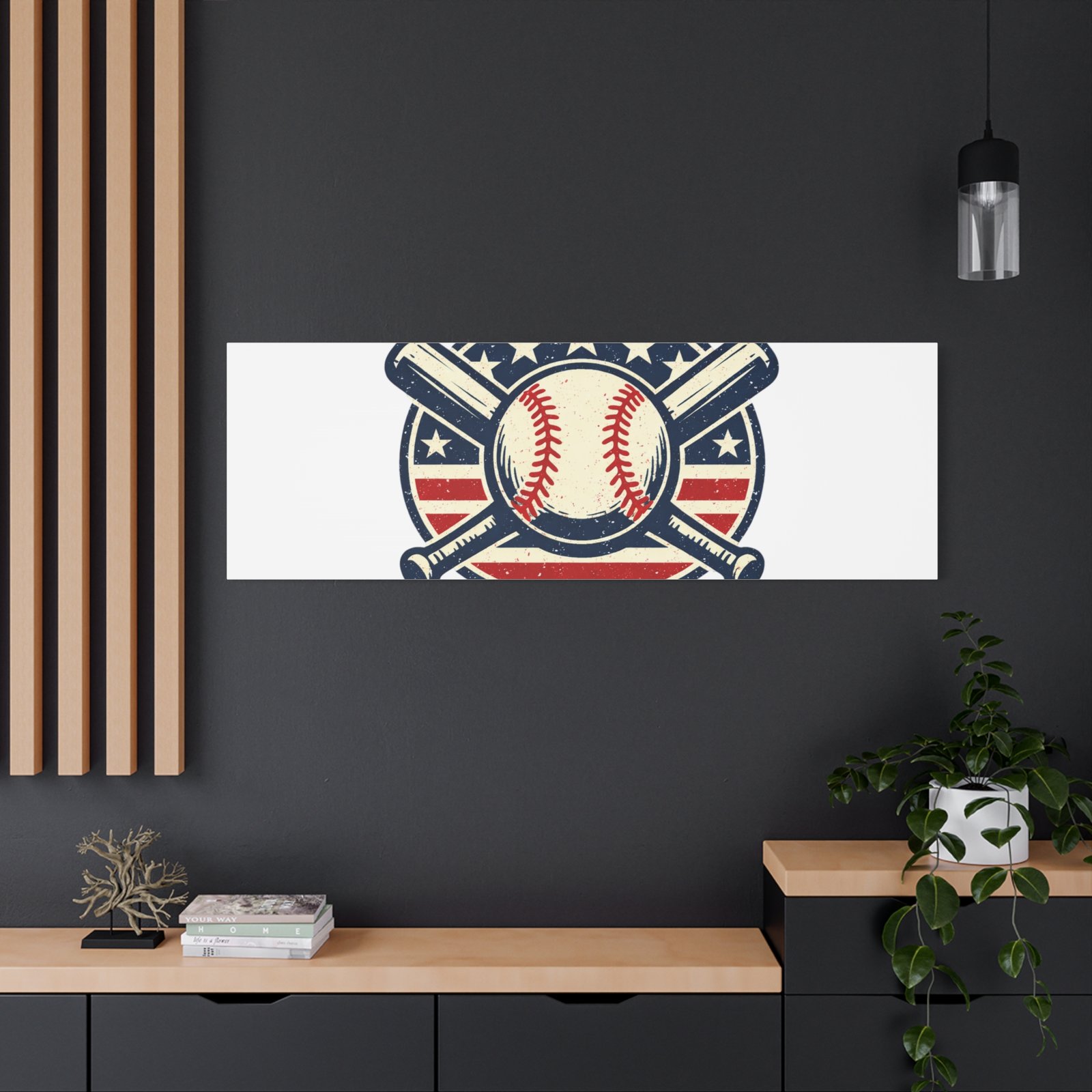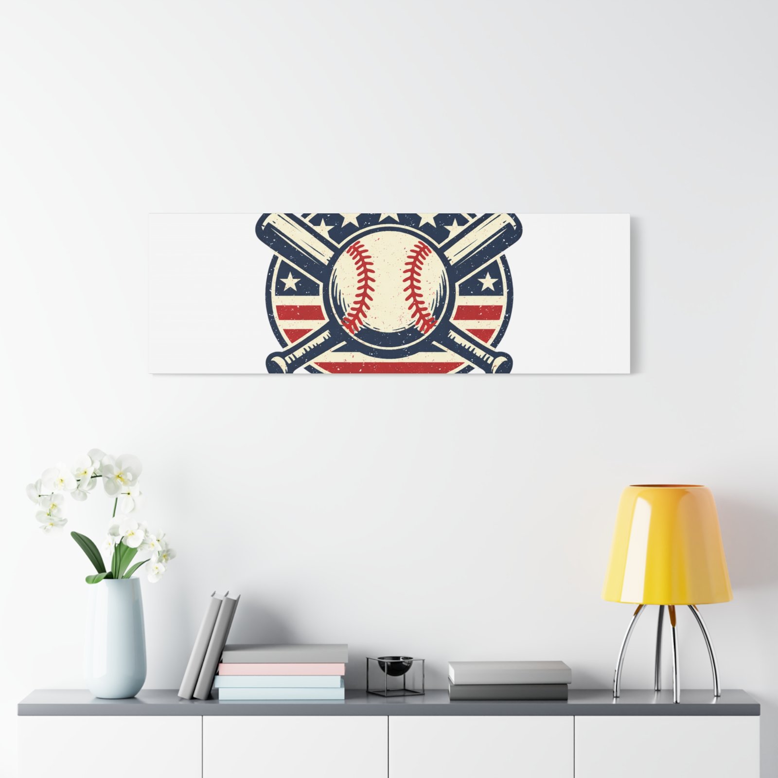 Vintage-inspired baseball emblem printed on matte stretched canvas, blending red, white and blue athletic typography with a weathered diamond motif. The artwork pairs crossed bats and a stitched ball over a striped star field for a ballpark-ready, patriotic vibe that fits the ‘Patriotic Baseball Fan Aesthetic’—nostalgic, competitive, and proudly sport-forward. Hang in a fan cave, office, or entryway to signal national pride and classic baseball spirit during season and watch parties.